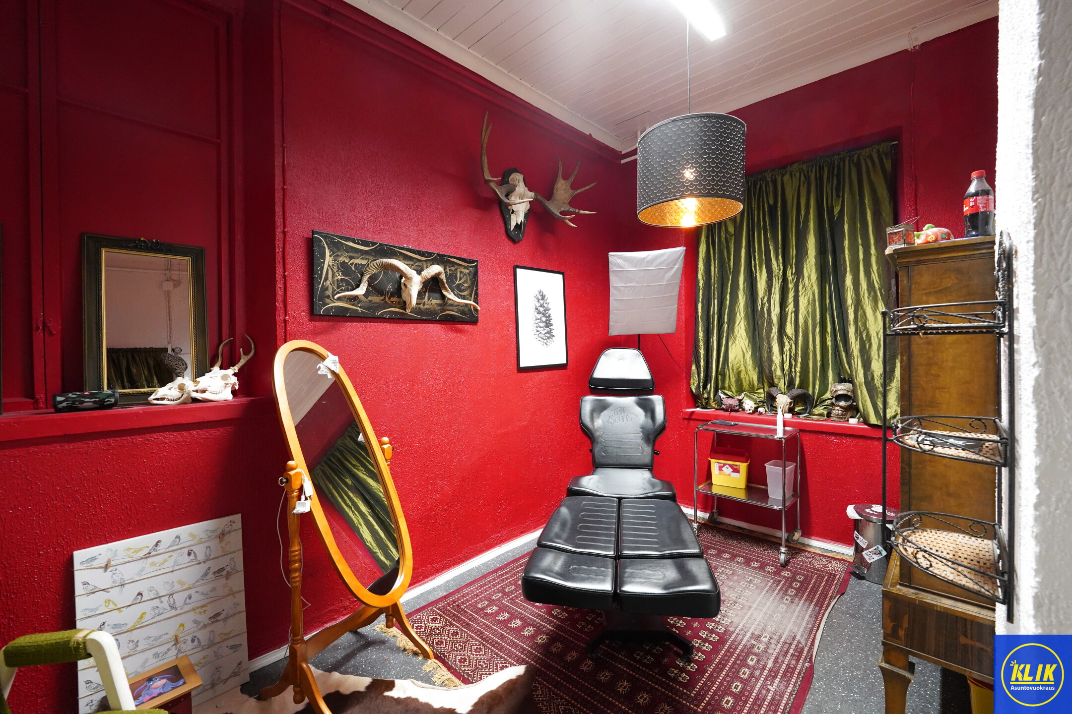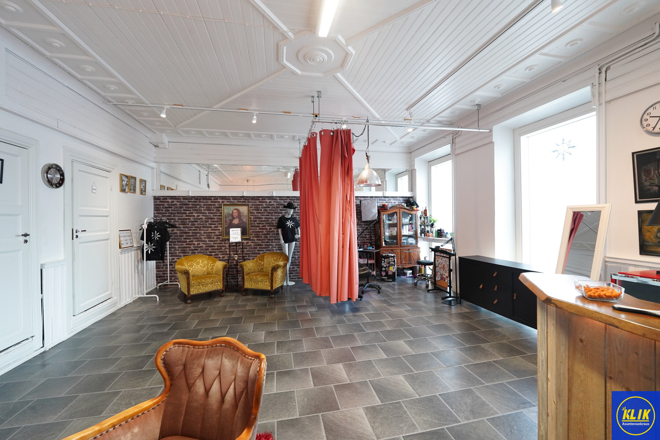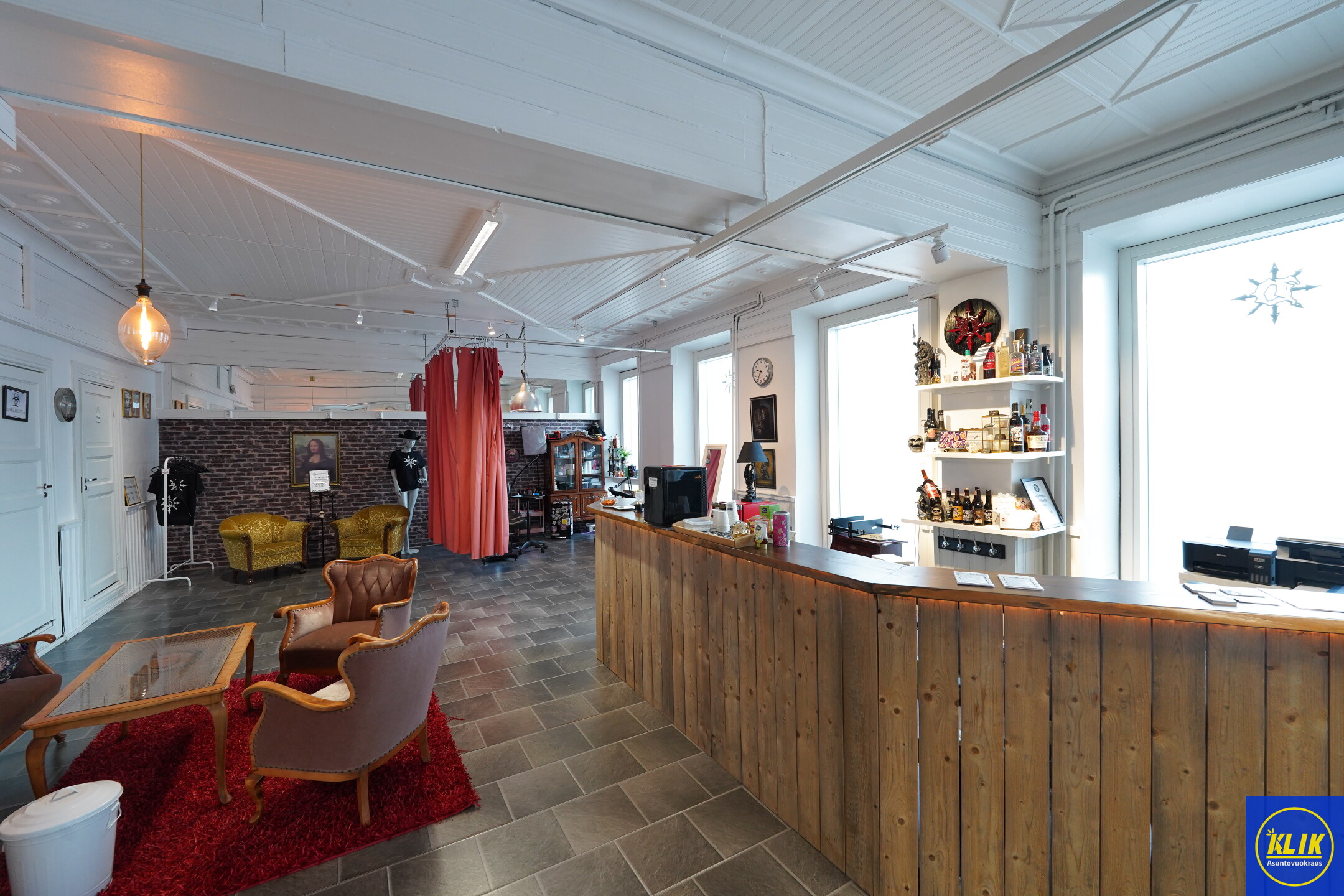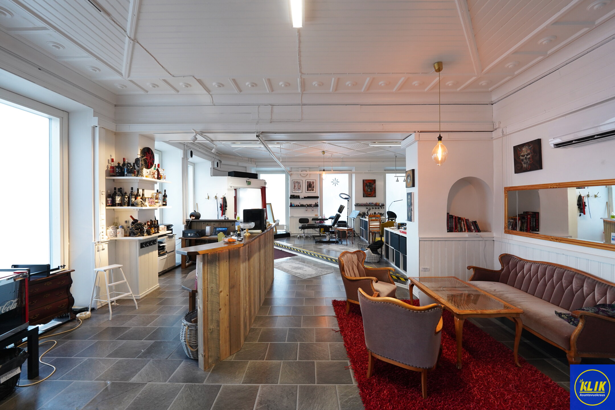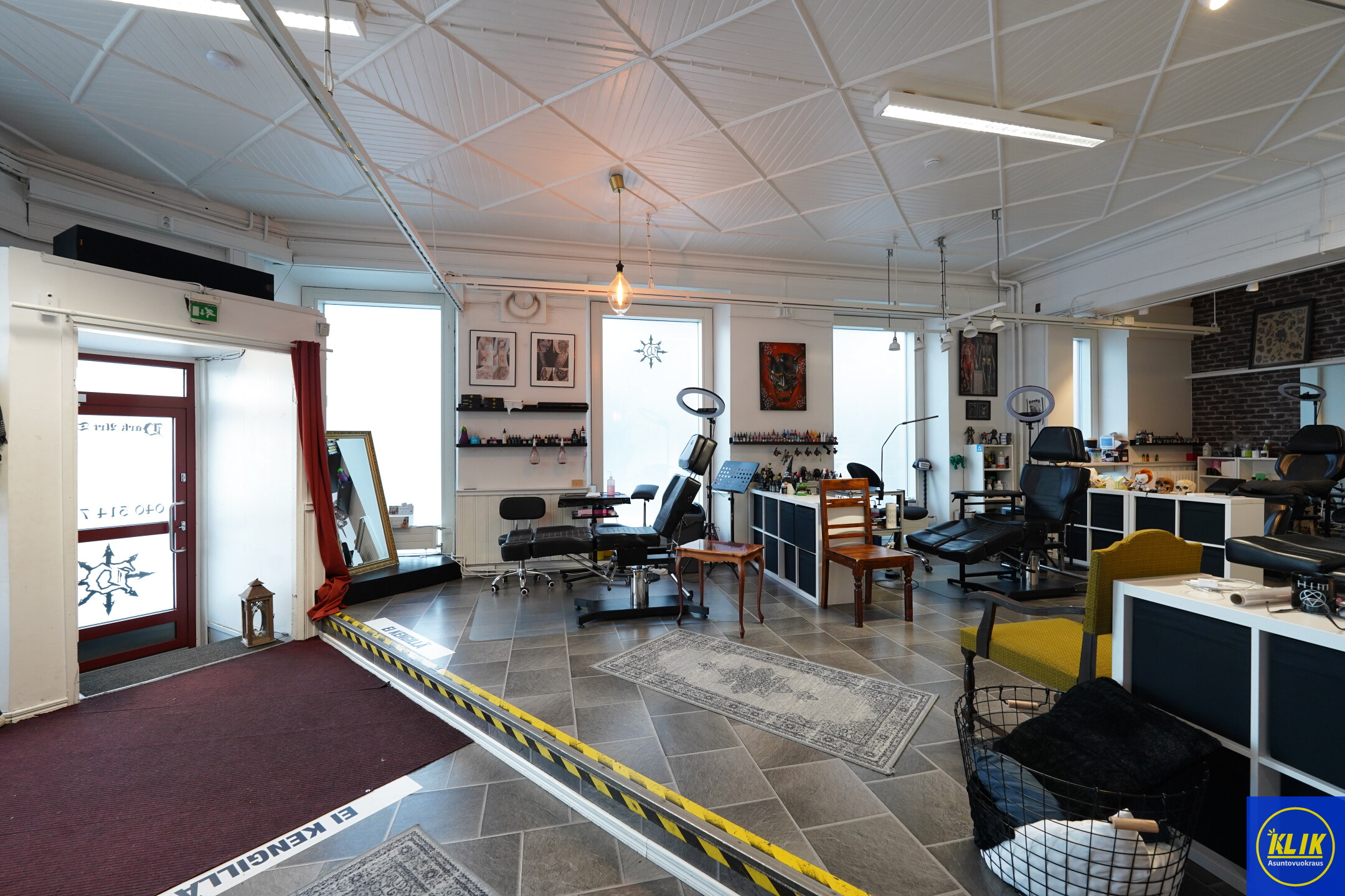 Tilassa on kaksi sisäänkäyntiä (yksi takapihalle ja asiakaskäynti kadulle). Tilat koostuvat: isosta avoimesta tilasta, sosiaalitiloista, erillisestä takahuoneesta sekä wc ja keittiötiloista.