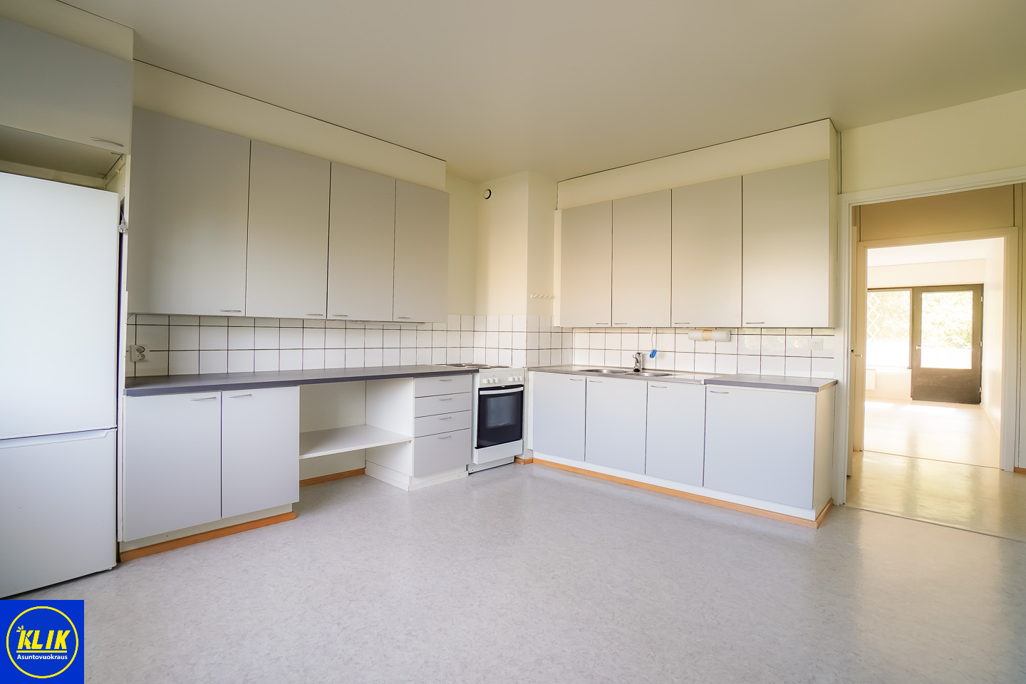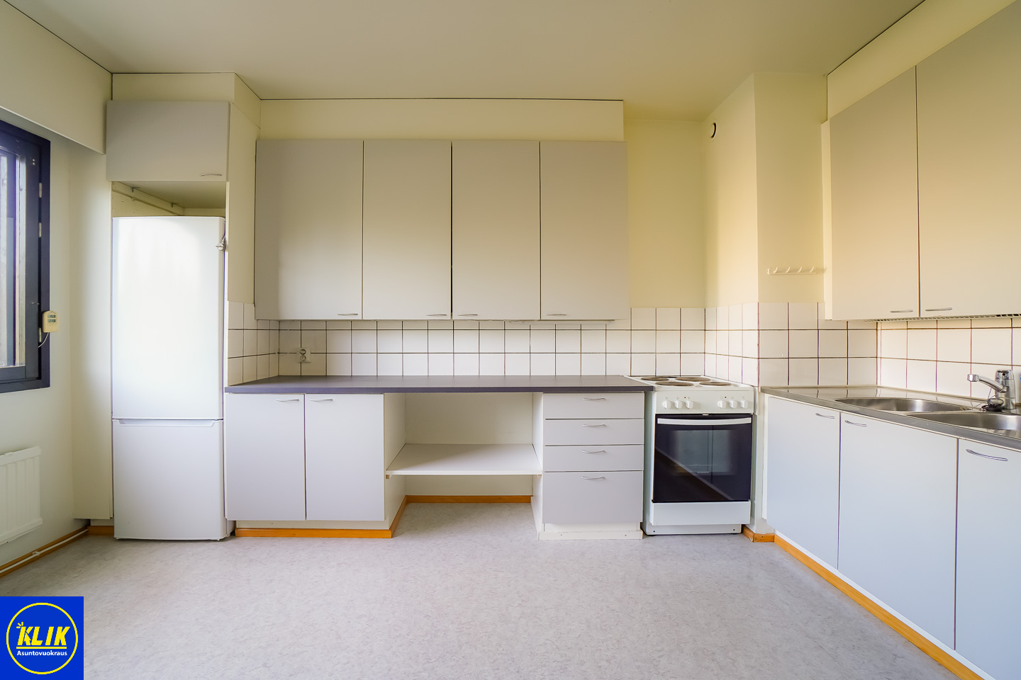 erillinen keittiölaminaattitasot keittiössä, sähköliesi, , jääkaappipakastin, tilaa isolle ruokapöydälle; paljon kaappitilaa; paljon työskentelytilaa