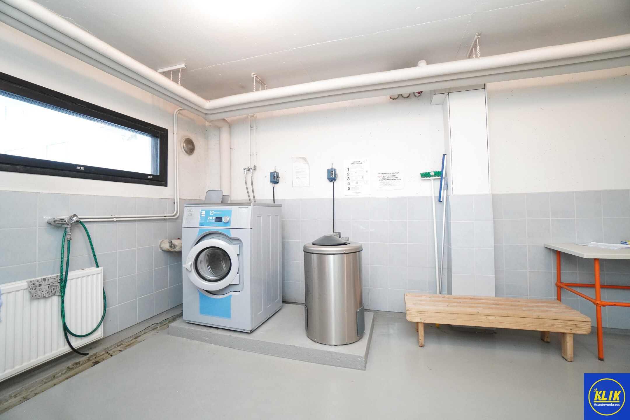 laattalattia; laattaseinä, , peilikaappi, suihku, , pesukonevalmius; taloyhtiössä pesutupa,