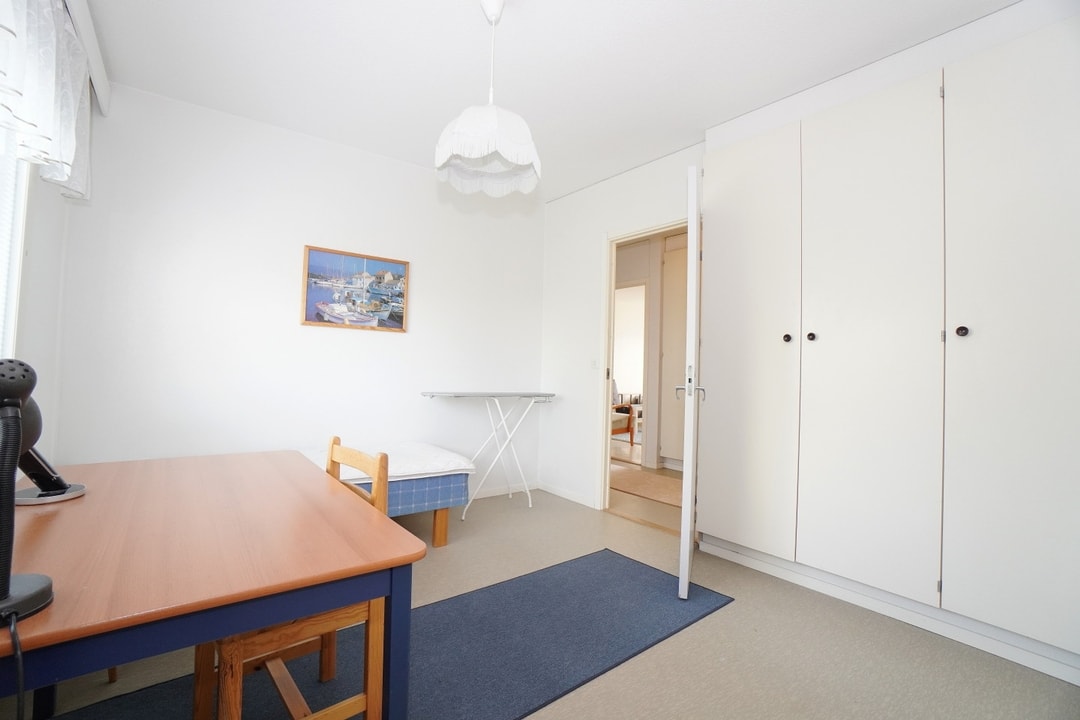 Makuhuoneessa on sängyn lisäksi työpöytä sekä paljon kaapistoja. Eteisessä on lisäksi reilusti kaapistoja säilytystä varten Asuntoon kuuluu oma häkkivarasto.