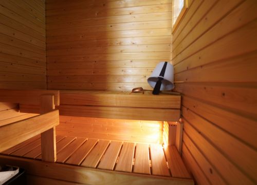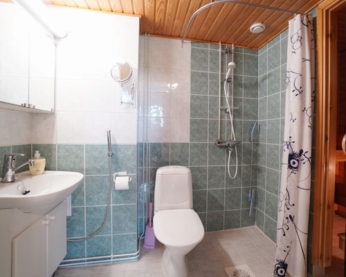 Laatoitettu kylpyhuone on tilava ja pesukoneelle on liitännät. Oma sauna kuuluu tähän asuntoon.