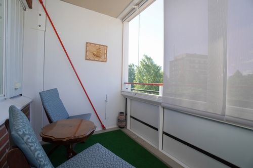 Asunnossa on kauttaaltaan vaaleat ja siistit pinnat. Ylimmästä kerroksesta on hienot näkymät ja parveke on helppo kalustaa lasituksen ansiosta.