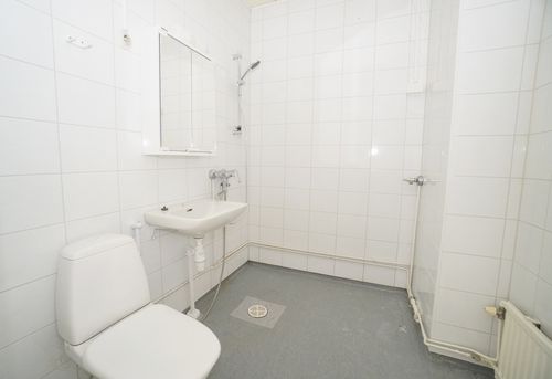 muovimatto; laattalattia, myös erillinen WC, peilikaappi, suihku, pesukonevalmius