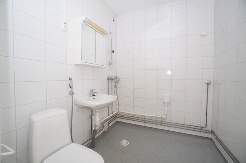 laattaseinä; epoksilattia, peilikaappi, suihku, pesukonevalmius