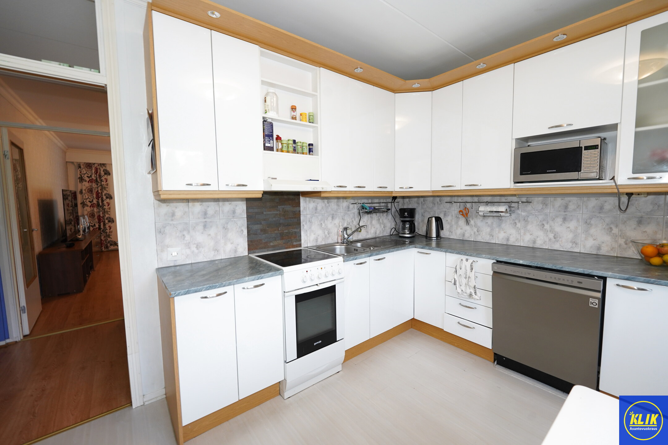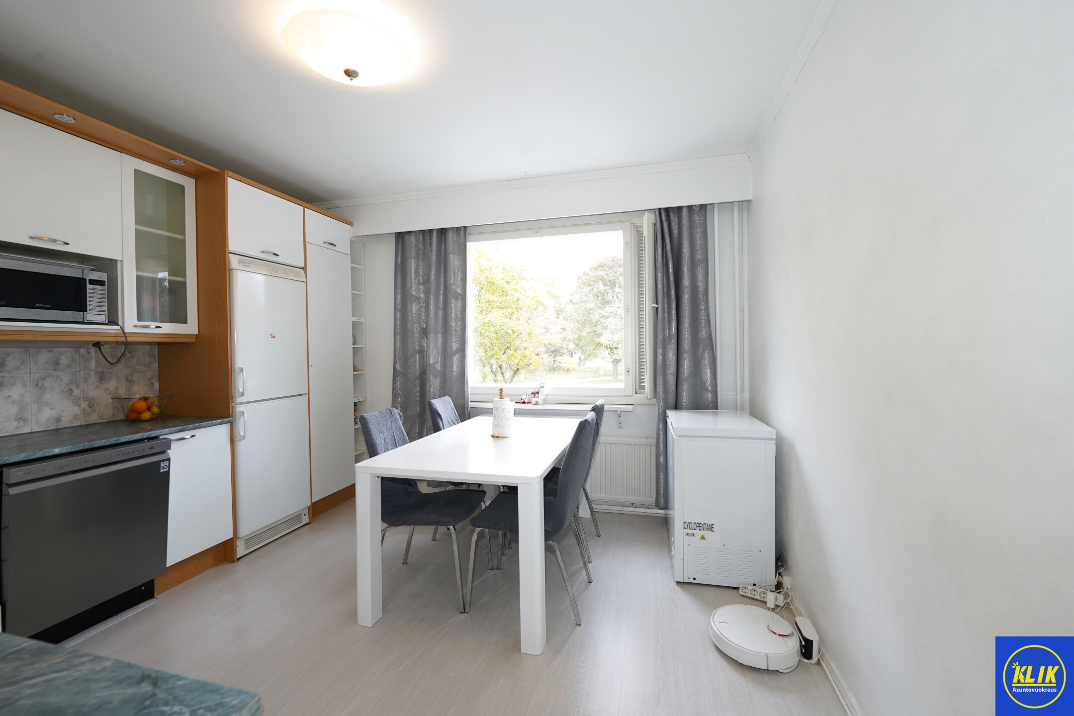 erillinen keittiölaminaattitasot keittiössä, keraaminen- tai induktioliesi; liesituuletin, astianpesukone (60cm), jääkaappipakastin, tilaa isolle ruokapöydälle; paljon kaappitilaa; paljon työskentelytilaa; mikrohylly