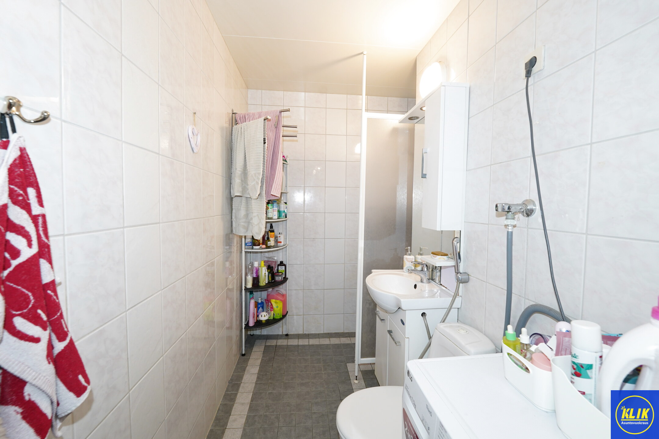 laattalattia; laattaseinä, , allaskaappi; peilikaappi, suihku; suihkuseinä, , pesukonevalmius,