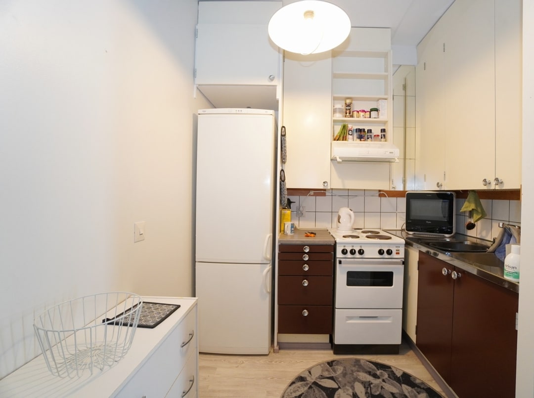keittokomero, terästasot keittiössä; laminaattitasot keittiössä, sähköliesi; liesituuletin, jääkaappipakastin
