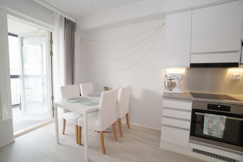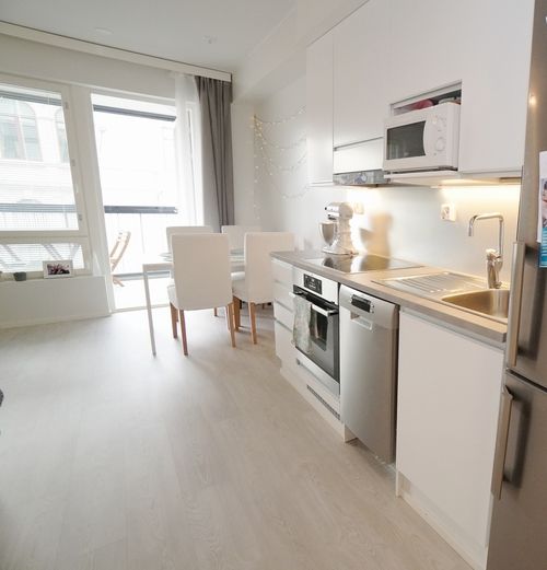 Koko asunto on kauttaaltaan siistissä, uudenveroisessa kunnossa. Keittiössä on rosteriset kodinkoneet ja sen yhteyteen saa ruokaryhmän. Keittiö ja olohuone on kätevästi sekä avarasti samassa tilassa. Olohuoneesta on käynti suurelle lasitetulle parvekkeelle. Tämä suuri parveke on varsinkin kesäisin todella ihana paikka juoda aamukahvinsa ja toimii mainiona lisätilana. Kokonsa puolesta parvekkeelle saa vaikka toisen ruokapöydän tai iltaisin on mukava käpertyä sohvalle viltin alle vaikka lukemaan.