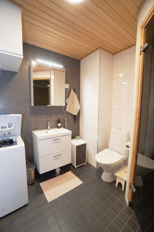 Tilavassa kylpyhuoneessa on oma selkeä paikka pyykinpesukoneelle sekä oma sauna.