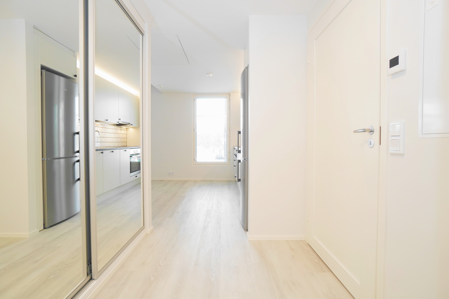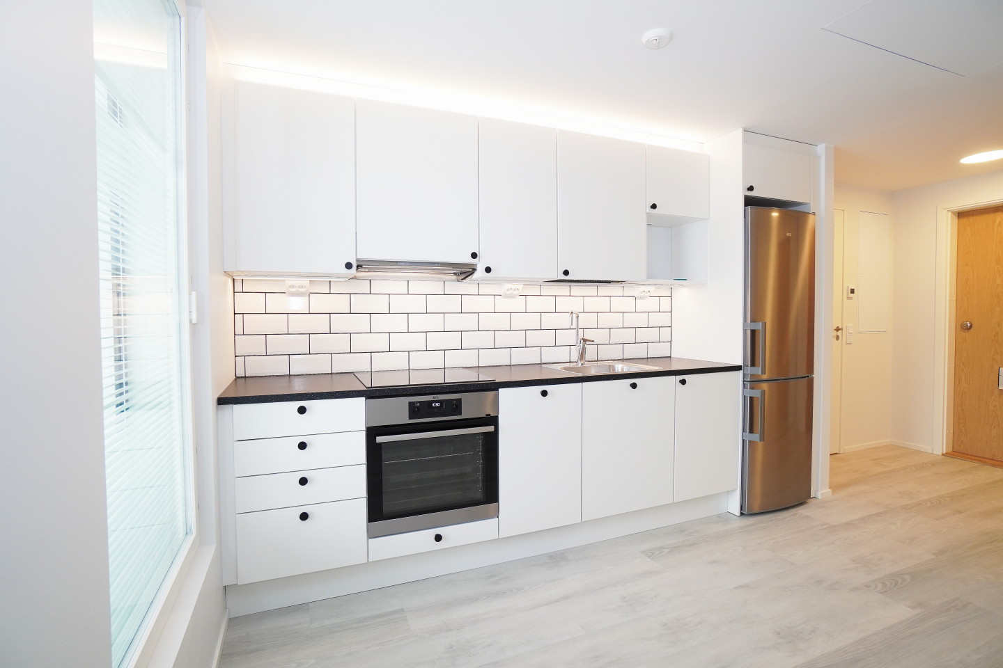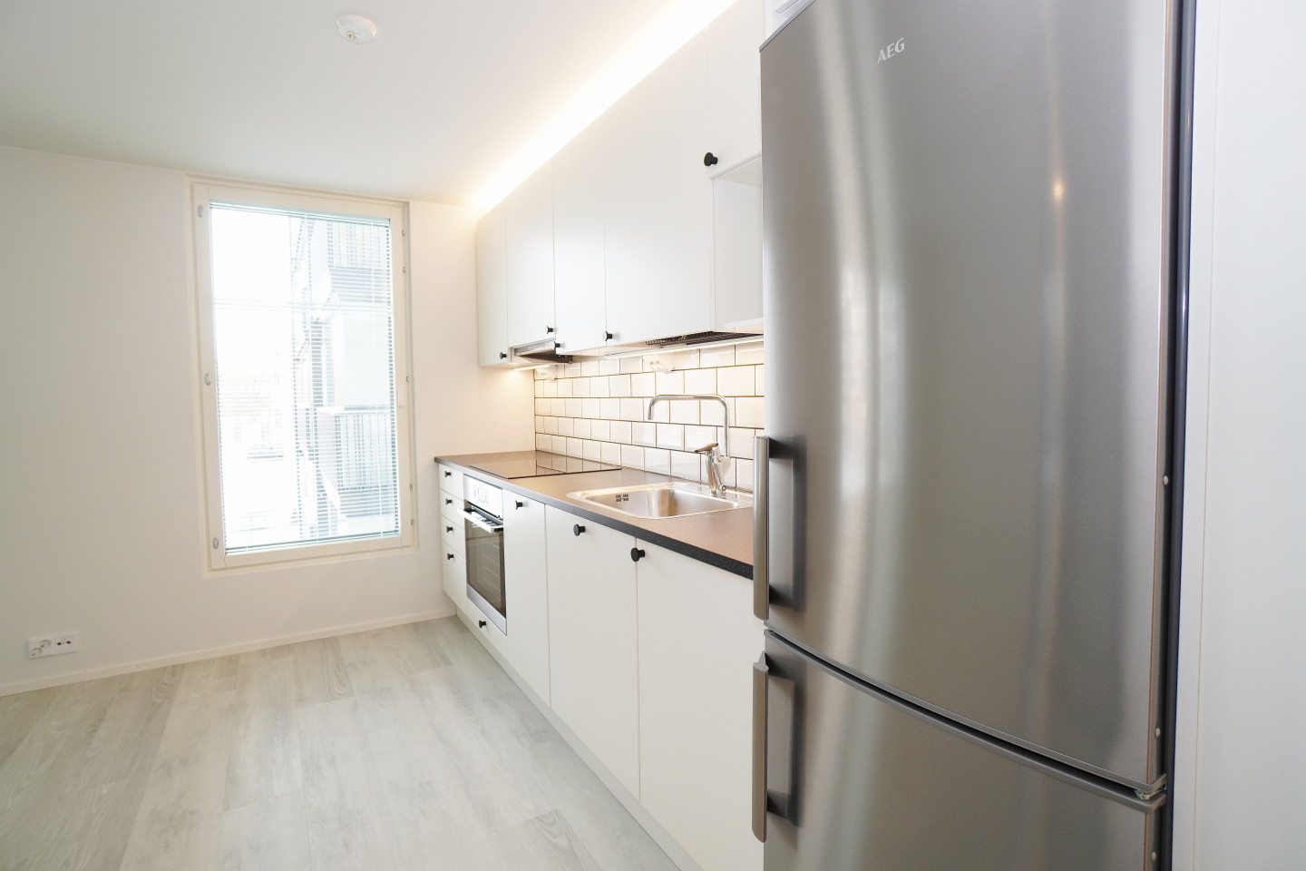 Asunnossa on kauttaaltaan kaunis vinyylilattia, joka on kulutusta kestävää ja äänetön lattia vaihtoehto.