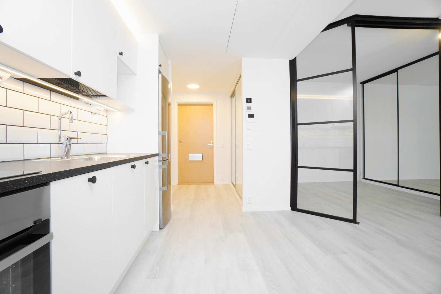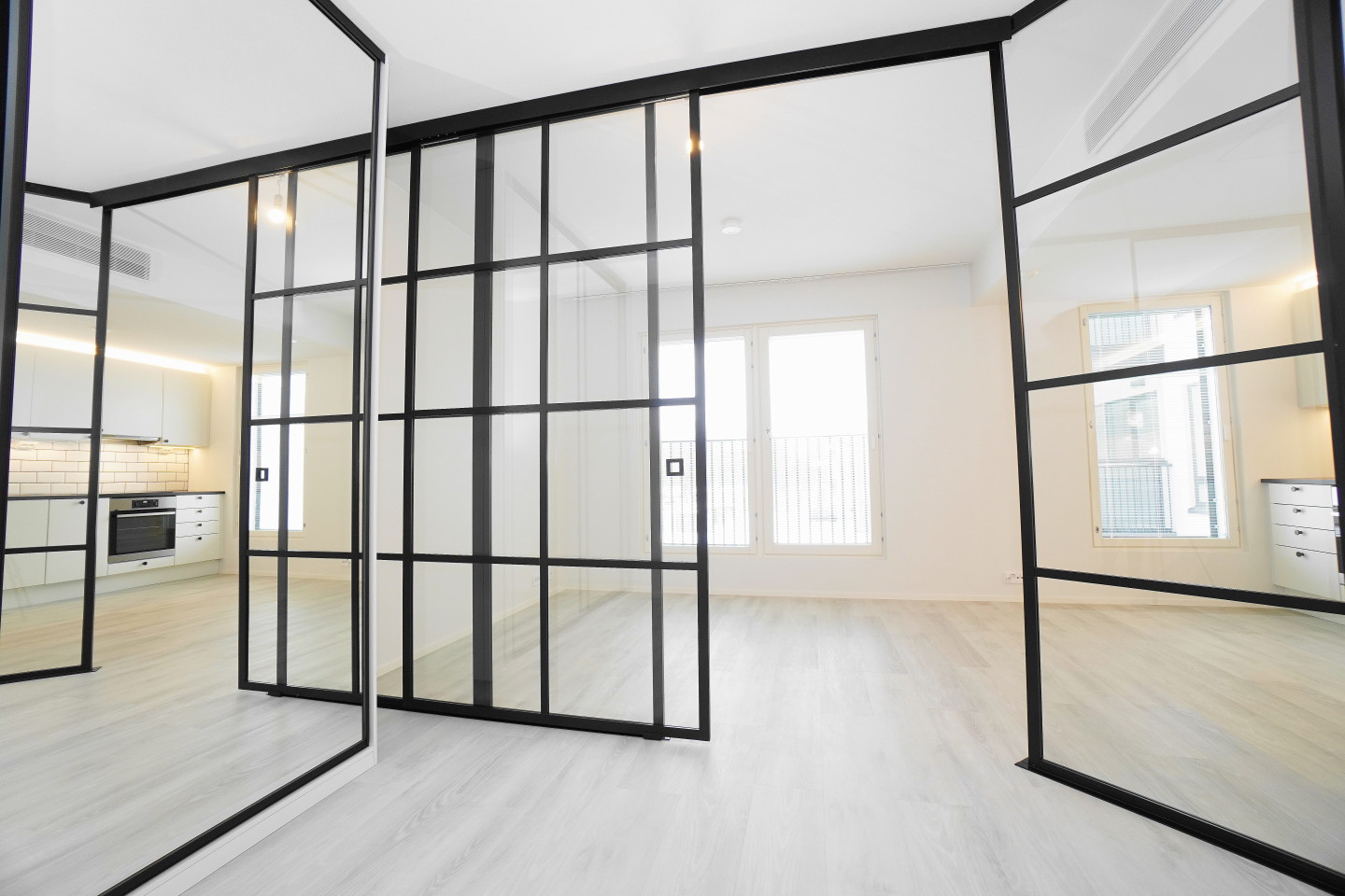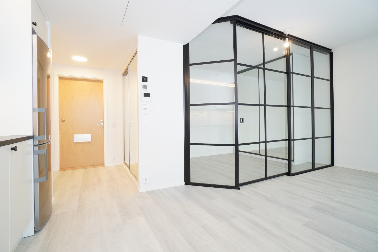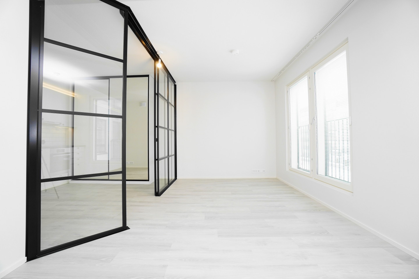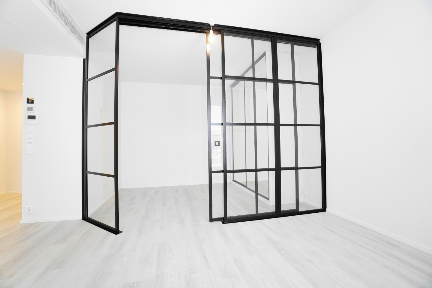 Trendikkäät lasiset mustin kehyksin jakaa makuutilan.