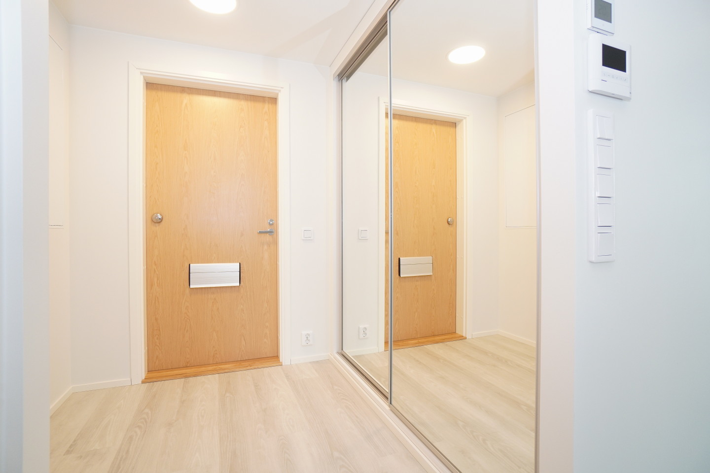Säilytystilaa peiliovikaapistojen ansiosta, jotka tuovat peiliominaisuudellaan lisä avaruuden tuntua.