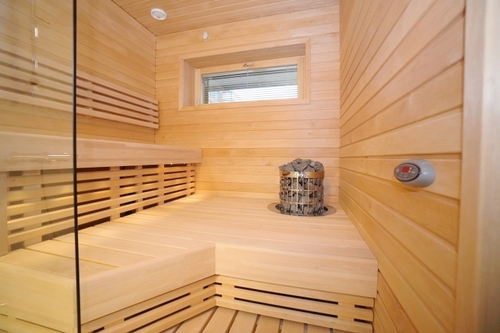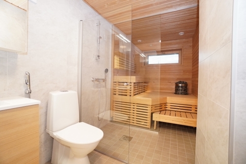 Kylpyhuone on hulppean tilava ja siellä on satsattu laadukkaisiin kalusteisiin sekä laattoihin. Oma sauna takaa pehmeät löylyt.