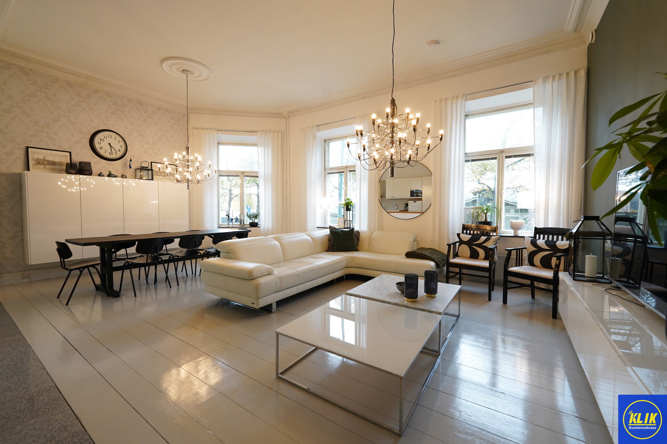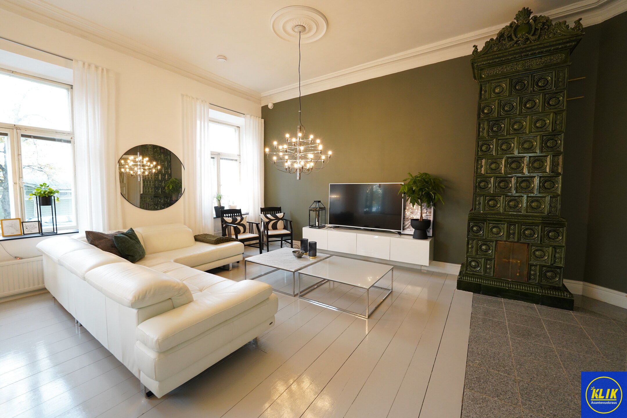 Paljon upeita yksityiskohtia: esim. kattorosetit, upeat katto- ja jalkalistat.