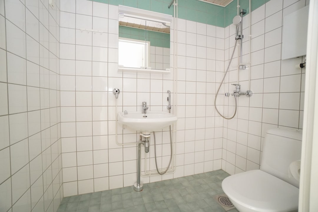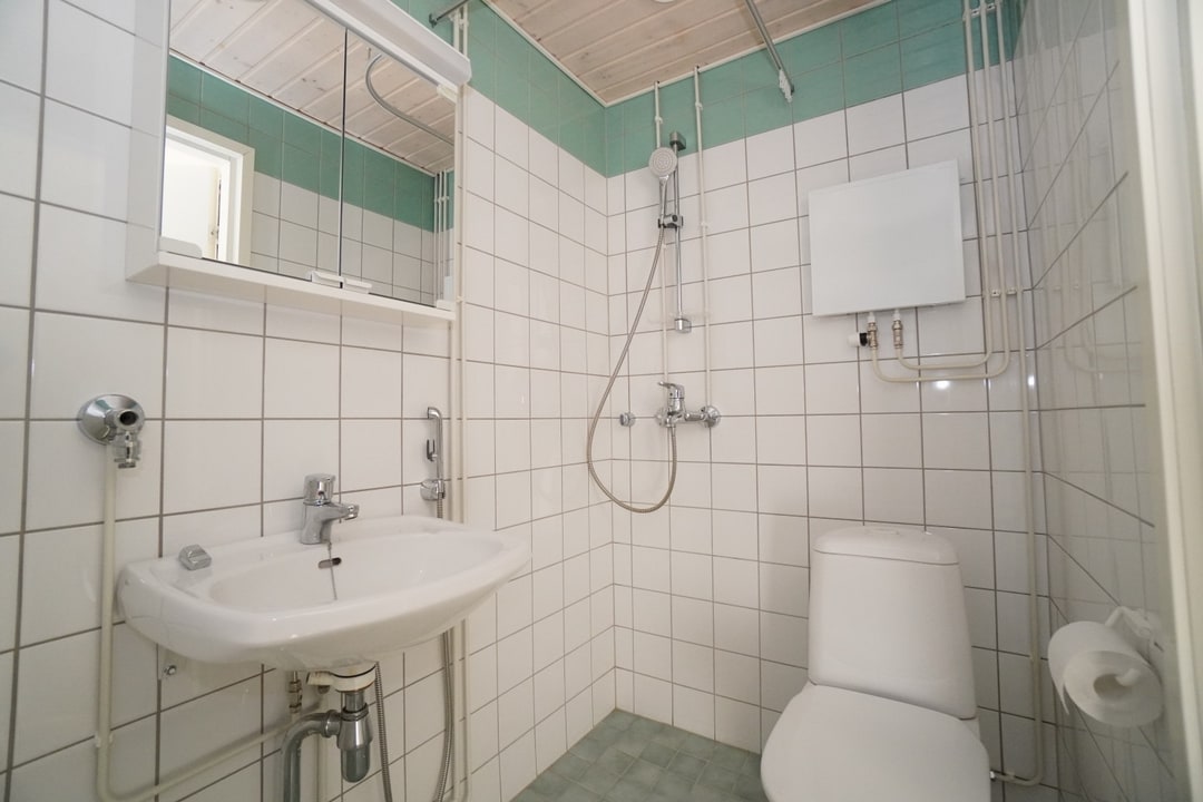 laattalattia; laattaseinä, peilikaappi, suihku, pesukonevalmius; taloyhtiössä pesutupa