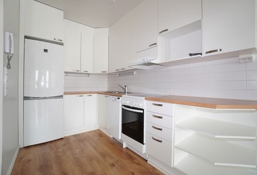 avokeittiö, laminaattitasot keittiössä, keraaminen- tai induktioliesi; liesituuletin, astianpesukone (60cm), jääkaappipakastin, tilaa isolle ruokapöydälle; paljon kaappitilaa; paljon työskentelytilaa