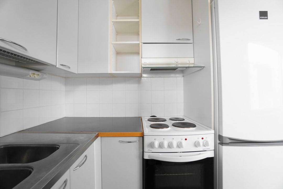 keittokomero, laminaattitasot keittiössä, sähköliesi; liesituuletin, jääkaappipakastin