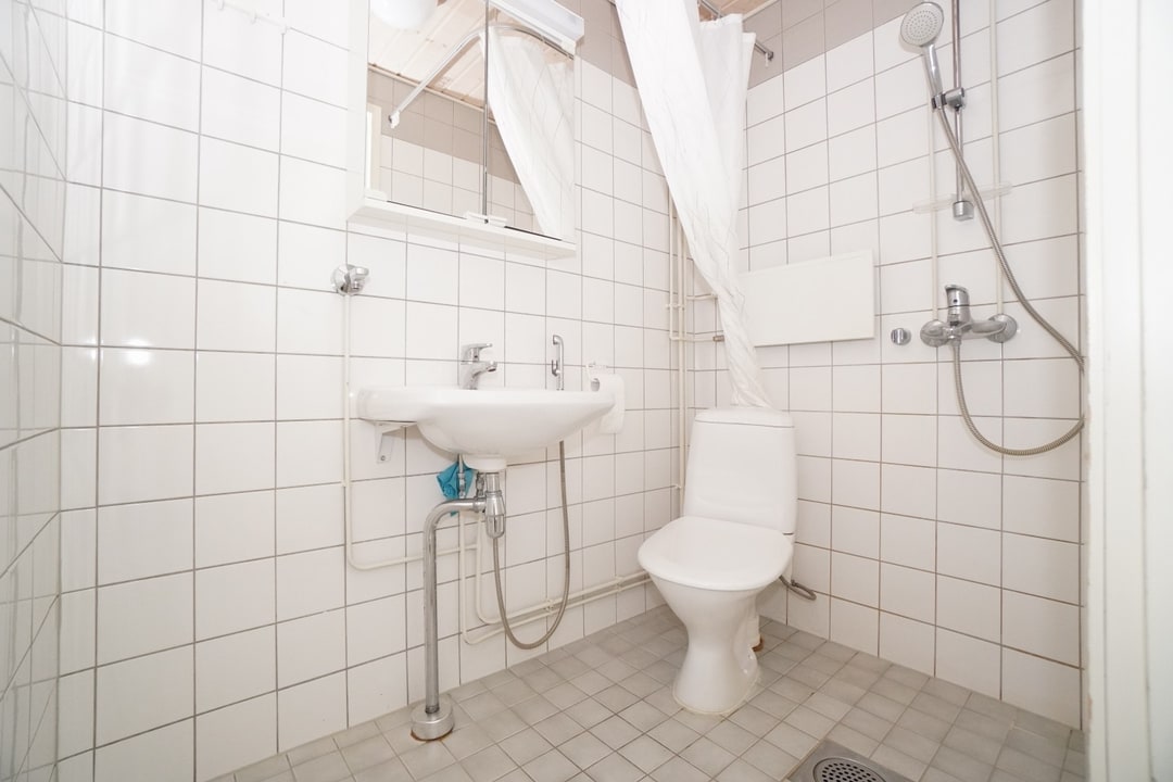 laattalattia; laattaseinä, peilikaappi, suihku, pesukonevalmius