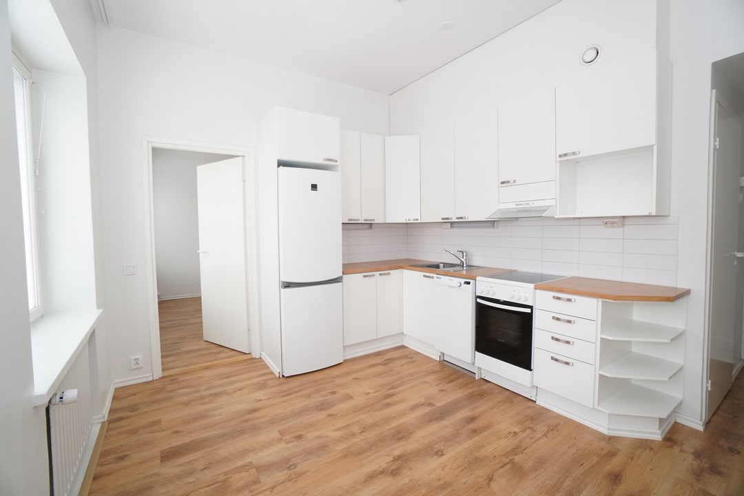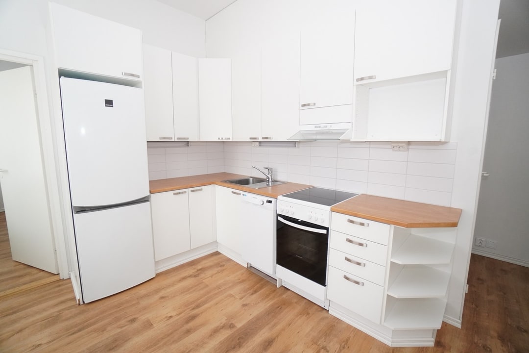erillinen keittiö, laminaattitasot keittiössä, keraaminen- tai induktioliesi; liesituuletin, astianpesukone (45cm), jääkaappipakastin, tilaa isolle ruokapöydälle; paljon kaappitilaa; paljon työskentelytilaa