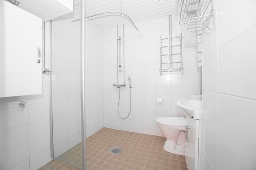 laattalattia; laattaseinä, allaskaappi; peilikaappi; muuta säilytystilaa WC:ssä, suihku; suihkuseinä, pesukonevalmius; taloyhtiössä pesutupa, lattialämmitys