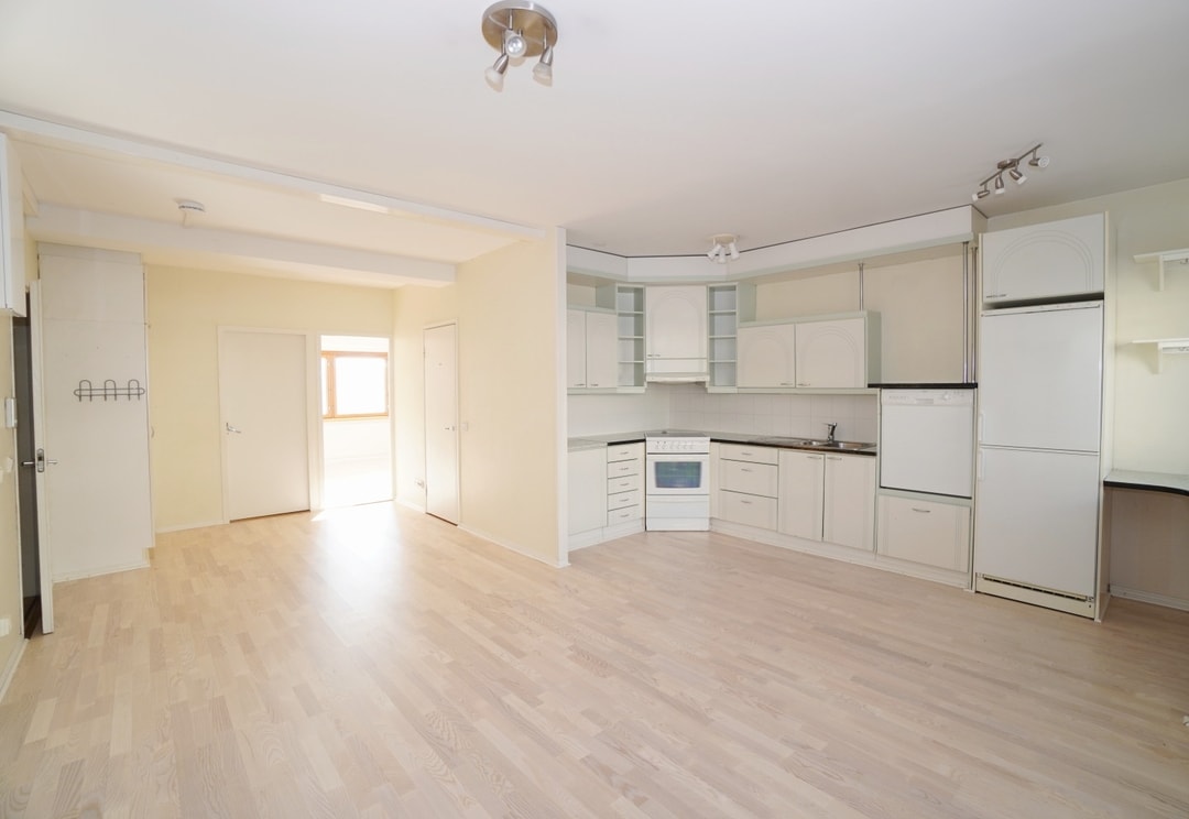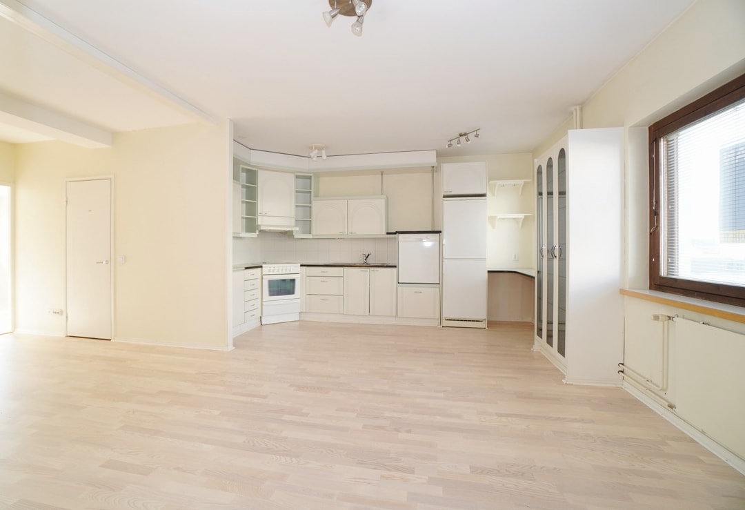 Tämän kodin keittiö ja olohuone ovat yhteistä tilaa. Keittiössä on siistit ja kaapistot sekä kodinkoneet. Viidennen kerroksen läpitalon asunto on valoisa eivätkä kaupungin äänet kantaudu ylimpiin kerroksiin. Koko asunnossa on kestävä ja kaunis parkettilattia ja vaaleat seinäpinnat.