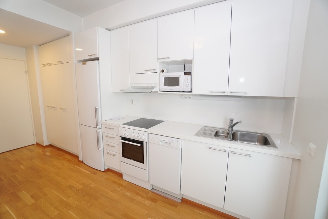 avokeittiö, laminaattitasot keittiössä, sähköliesi; liesituuletin, astianpesukone (45cm), jääkaappipakastin, mikro valmiina keittiössä