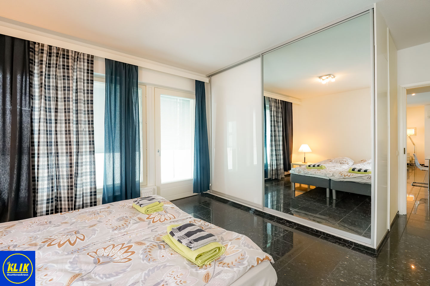 Lattiat: kivi- / laattalattiat, seinät: maalatut seinät, katto: maalattu katto, ikkunat:sälekaihtimet; tuuletusikkunat, erillinen makuuhuone; useita makuuhuoneita; makuuhuoneessa säilytystilaa; makuuhuoneessa liukuovikaapit; parisänky mahtuu makuutilaan; erillinen vaatehuone, lasitettu parveke, Huoneistokohtaiset erilliset säilytystilat taloyhtiön käytännön mukaan; Erillinen varastotila sisältyy, muut tilat: autopaikat taloyhtiön käytännön mukaisesti; autohallipaikka vuokrattavissa; valoisa asunto; paljon ikkunoita; kulmahuoneisto; koneellinen ilmanvaihto