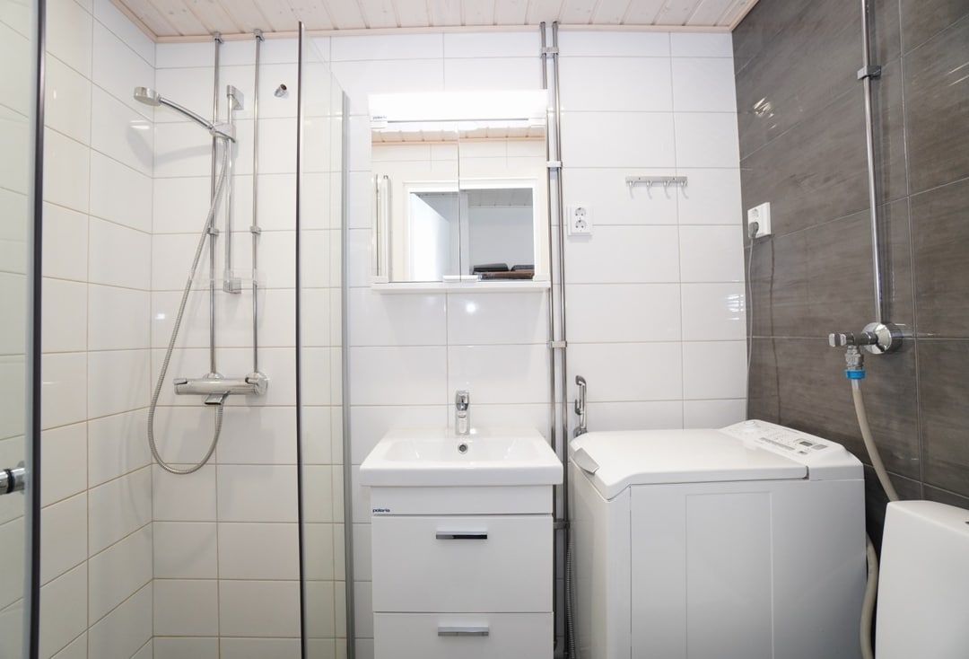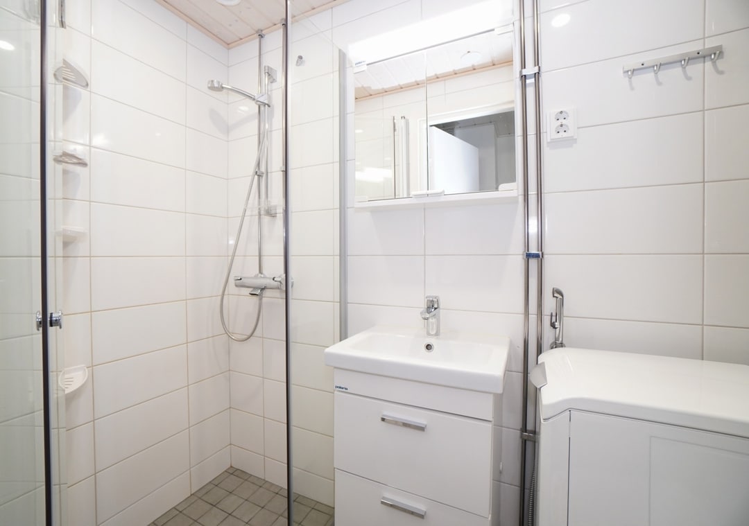 laattalattia; laattaseinä, allaskaappi; peilikaappi, suihku; suihkuseinä, lattialämmitys