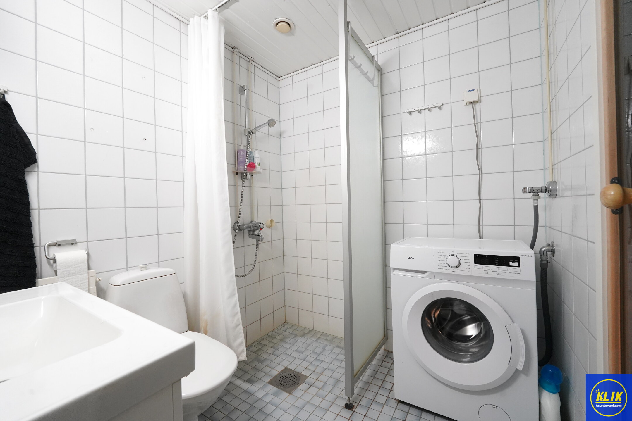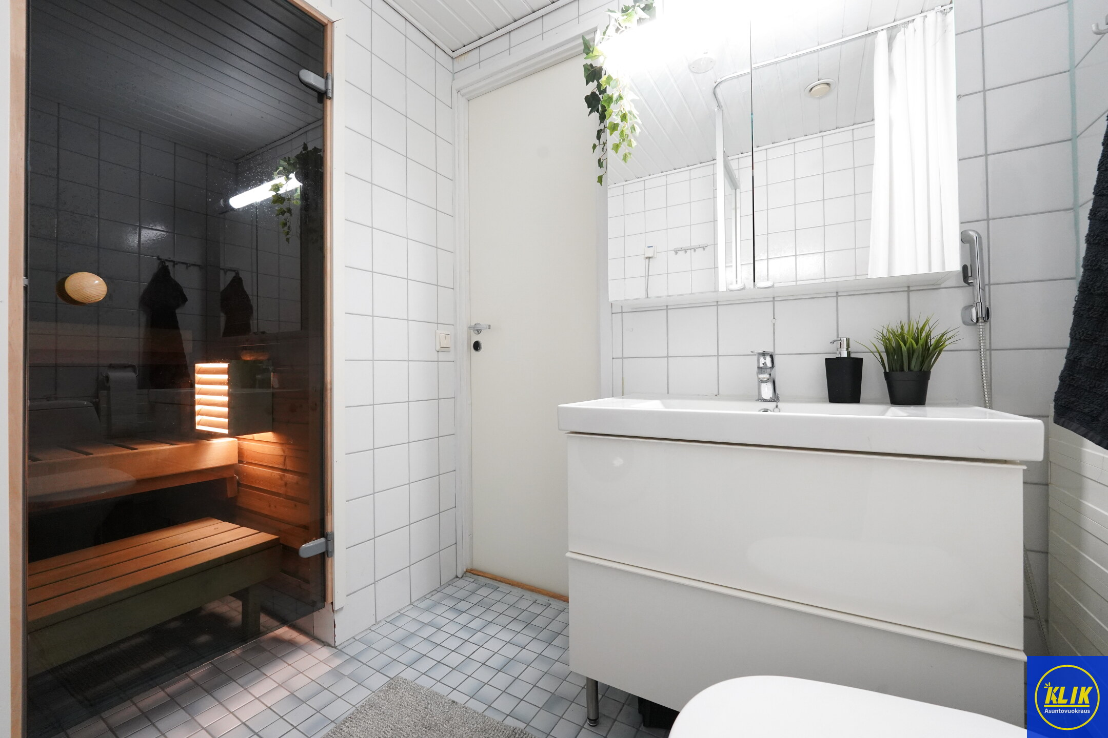 laattalattia; laattaseinä, , allaskaappi; peilikaappi, suihku; suihkuseinä, , pesukonevalmius; taloyhtiössä kuivaushuone, oma sauna; kylpyhuoneessa kuivauspatteri