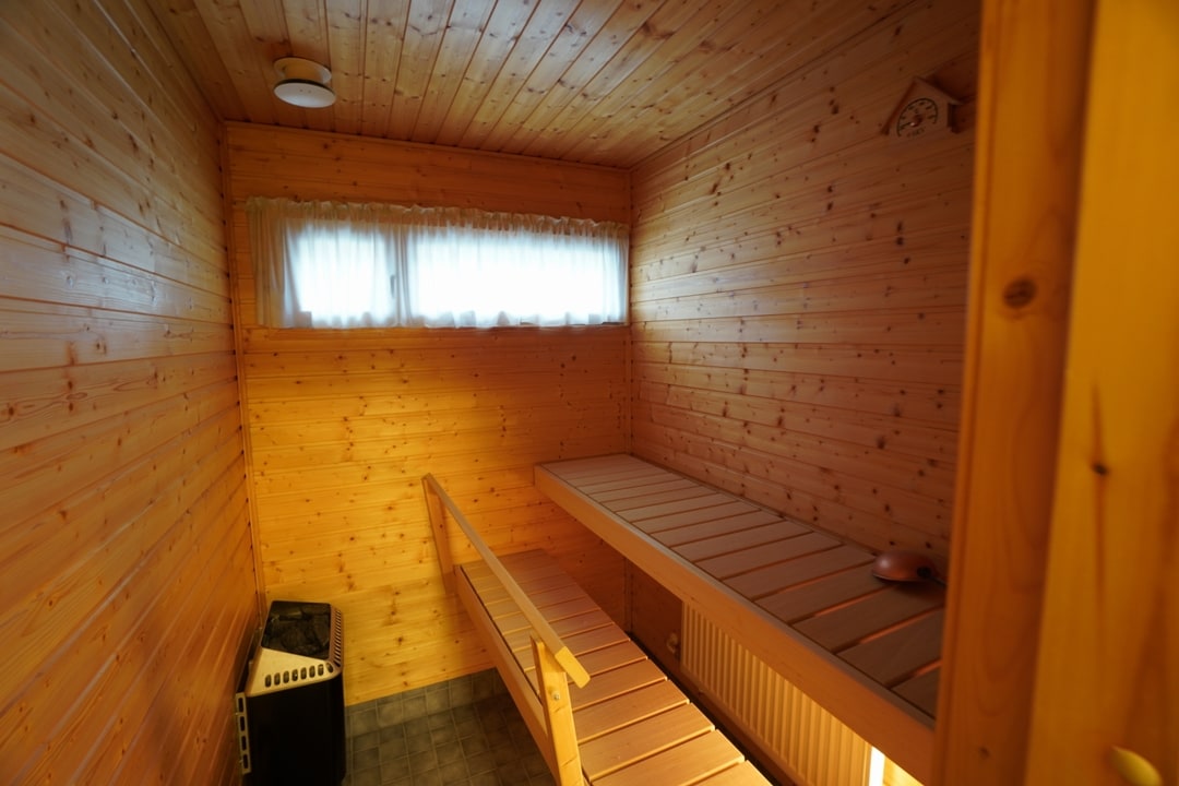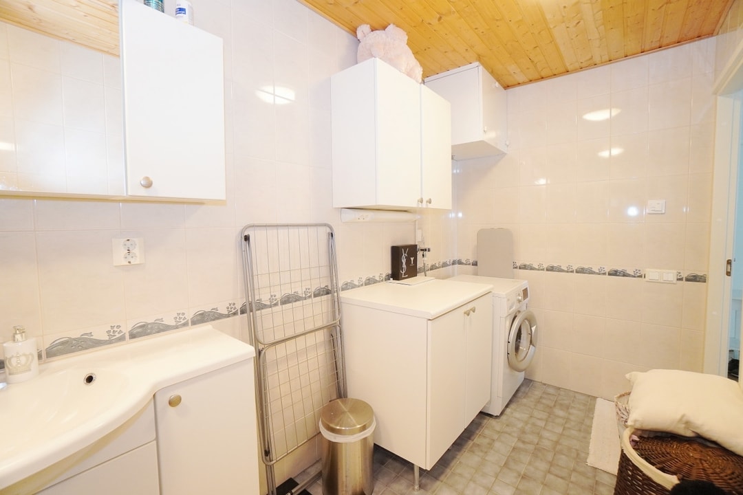 Kylpyhuone on todella iso; pesutorni mahtuu hyvin ja pyykkien kuivumiselle jää vielä reilusti tilaa. Kokonaisuuden kruunaa oma sauna!