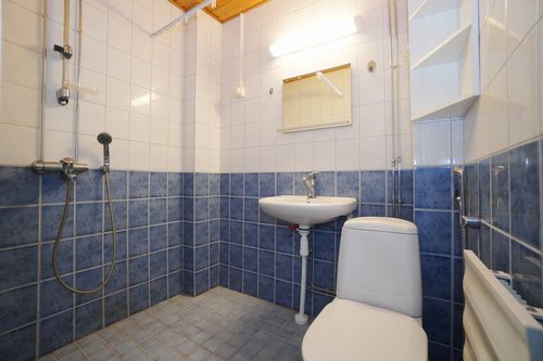Siisti laatoitettu kylpyhuone, johon mahtuu pesukone. Kylpyhuone on asuntoon nähden tilava ja sinne mahtuu vaikka lisäkaapisto.