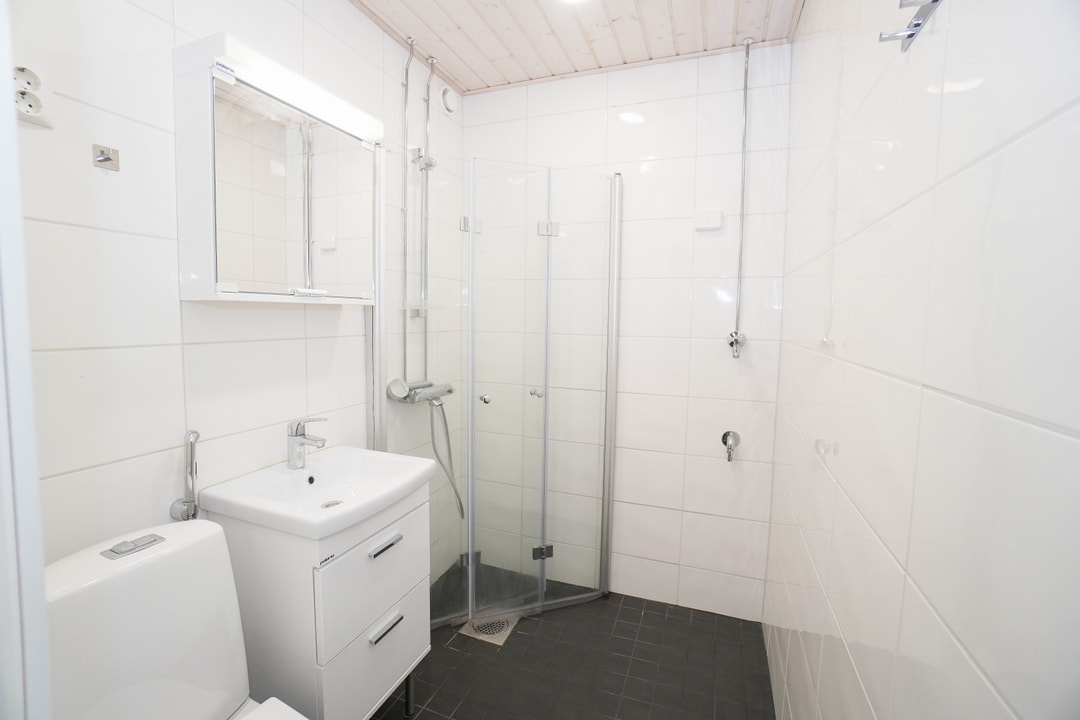 laattalattia; laattaseinä, allaskaappi; peilikaappi, suihku; suihkuseinä, pesukonevalmius, lattialämmitys