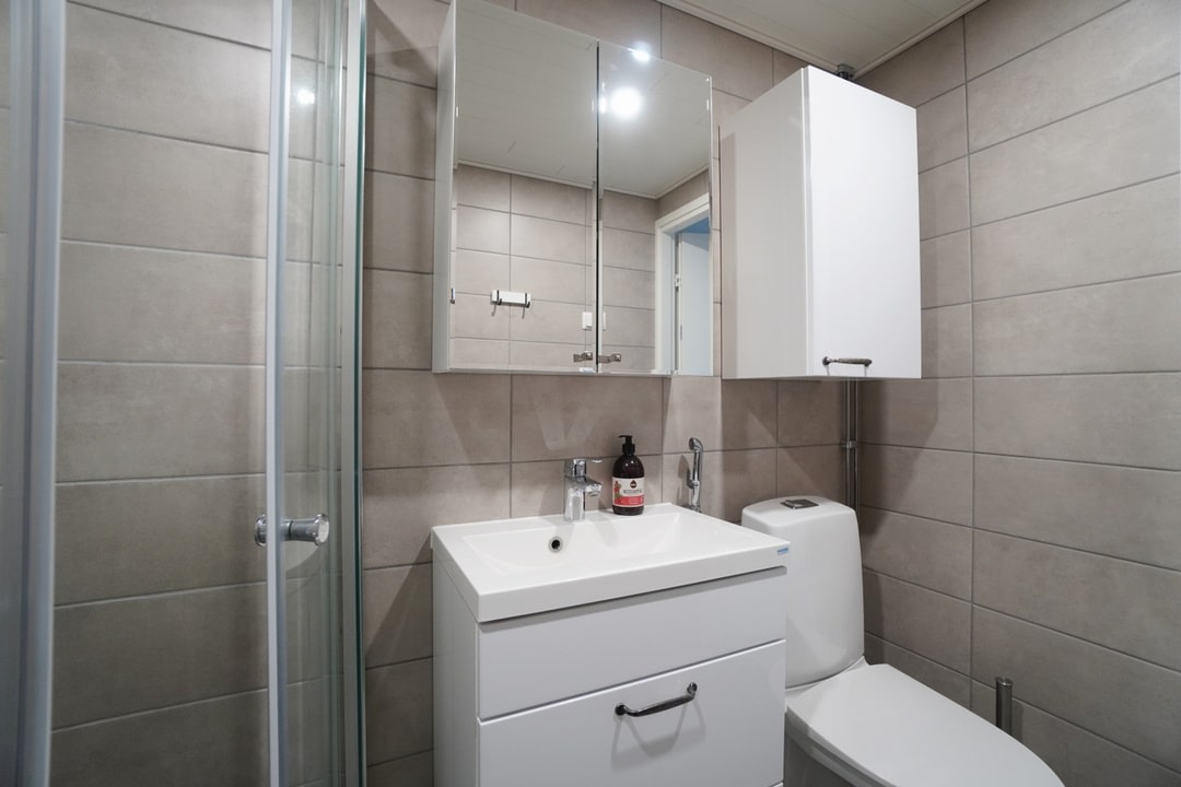 laattalattia; laattaseinä, allaskaappi; peilikaappi, suihku; suihkukaappi, pesukone; pesukonevalmius, lattialämmitys