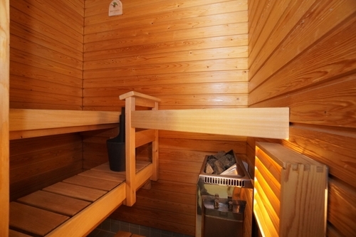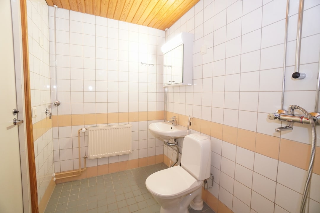 Laatoitettuun kylpyhuoneeseen saa pesukoneen ja kalusteet ovat siistit. Oma sauna kruuna kokonaisuuden. Tilassa on mukavuutta lisäävä lattialämmitys.