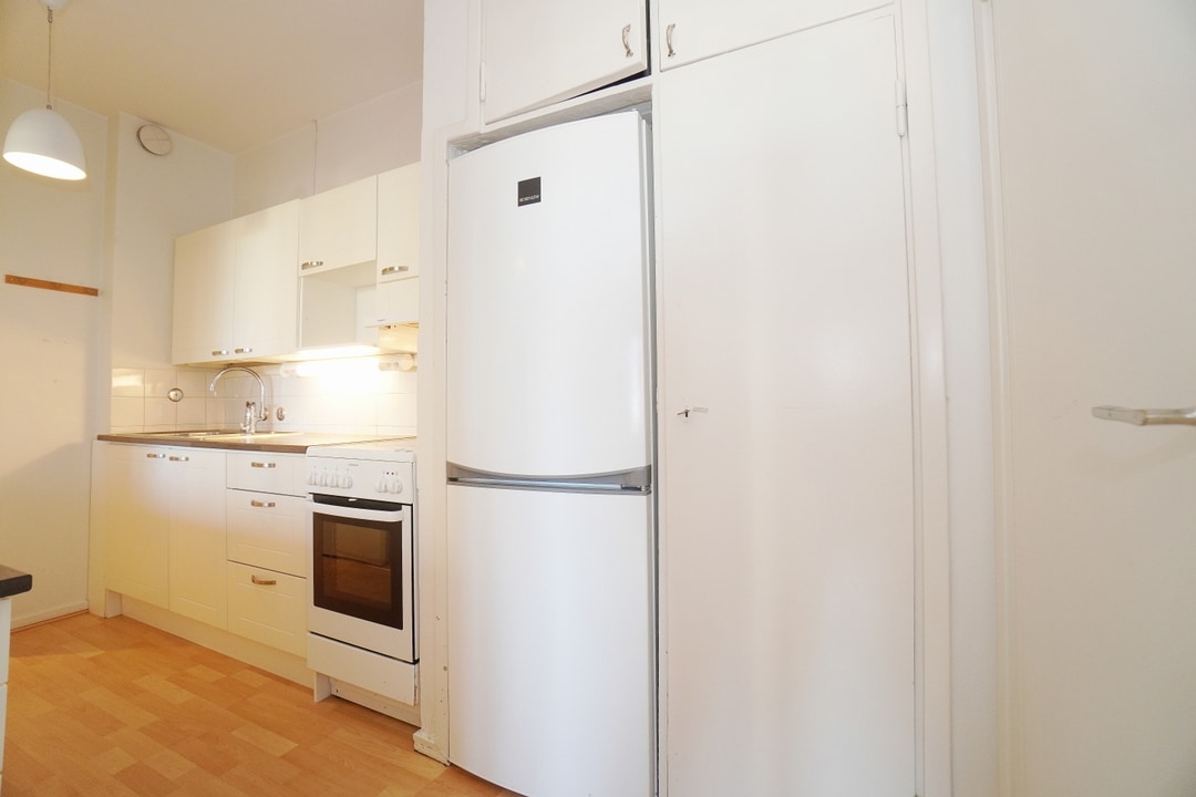 Asunnon pinnat ovat siistissä kunnossa, lattiassa on laminaatti kautta asunnon ja seinät on maalattu vaaleiksi. Keittiö on varustukseltaan hyvä ja sekin on hiljattain uusittu. Kaapistoja on reilusti ja kodinkoneet ovat hyväkuntoiset.