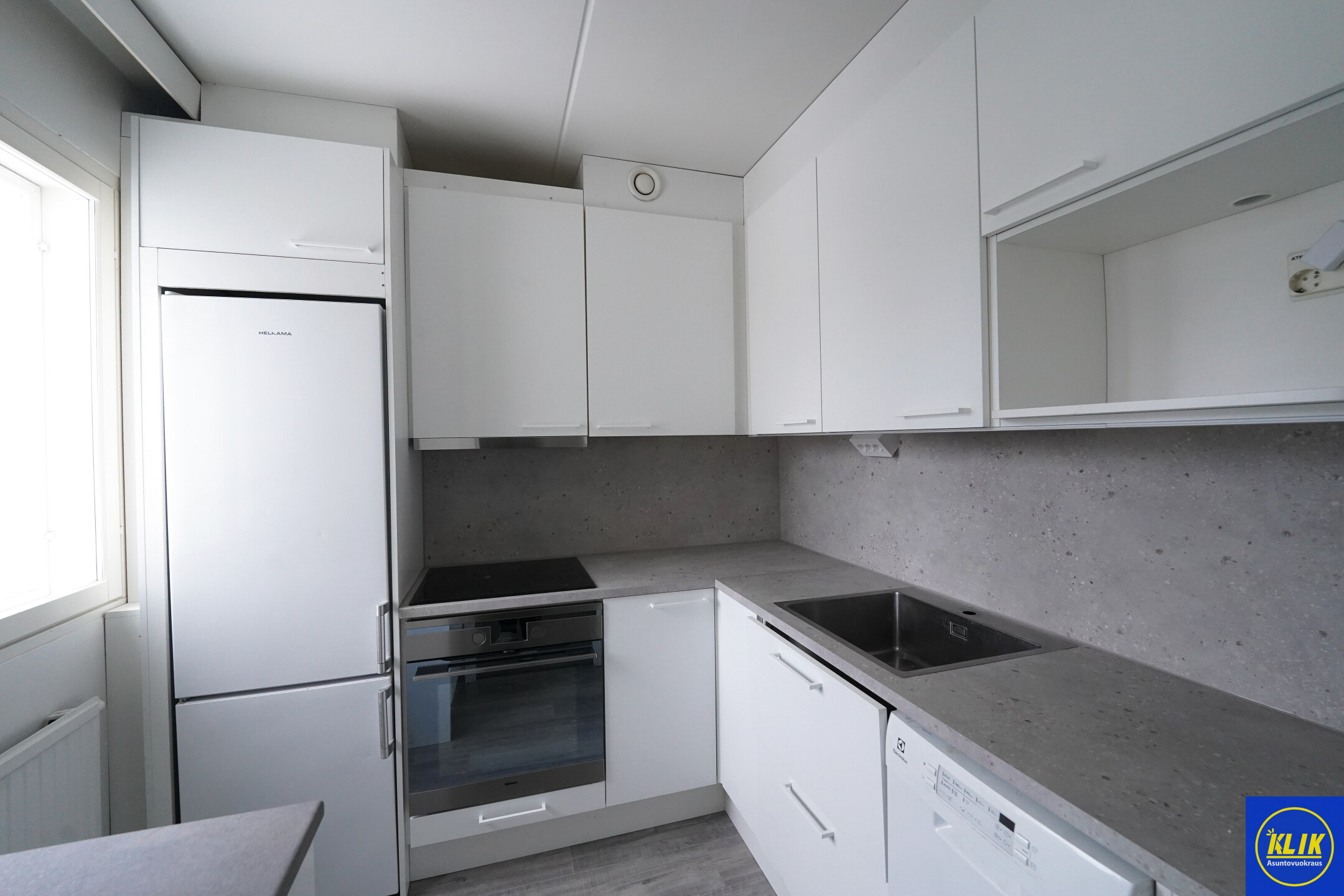 keittokomeroterästasot keittiössä; laminaattitasot keittiössä, sähköliesi, , jääkaappipakastin, suuri tiskipöytä; mikro valmiina keittiössä , , , , , ,