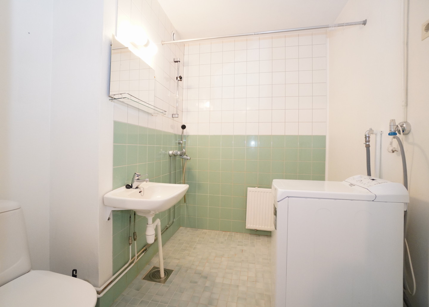 laattalattia; osittainen laattaseinä, suihku, pesukone; pesukonevalmius