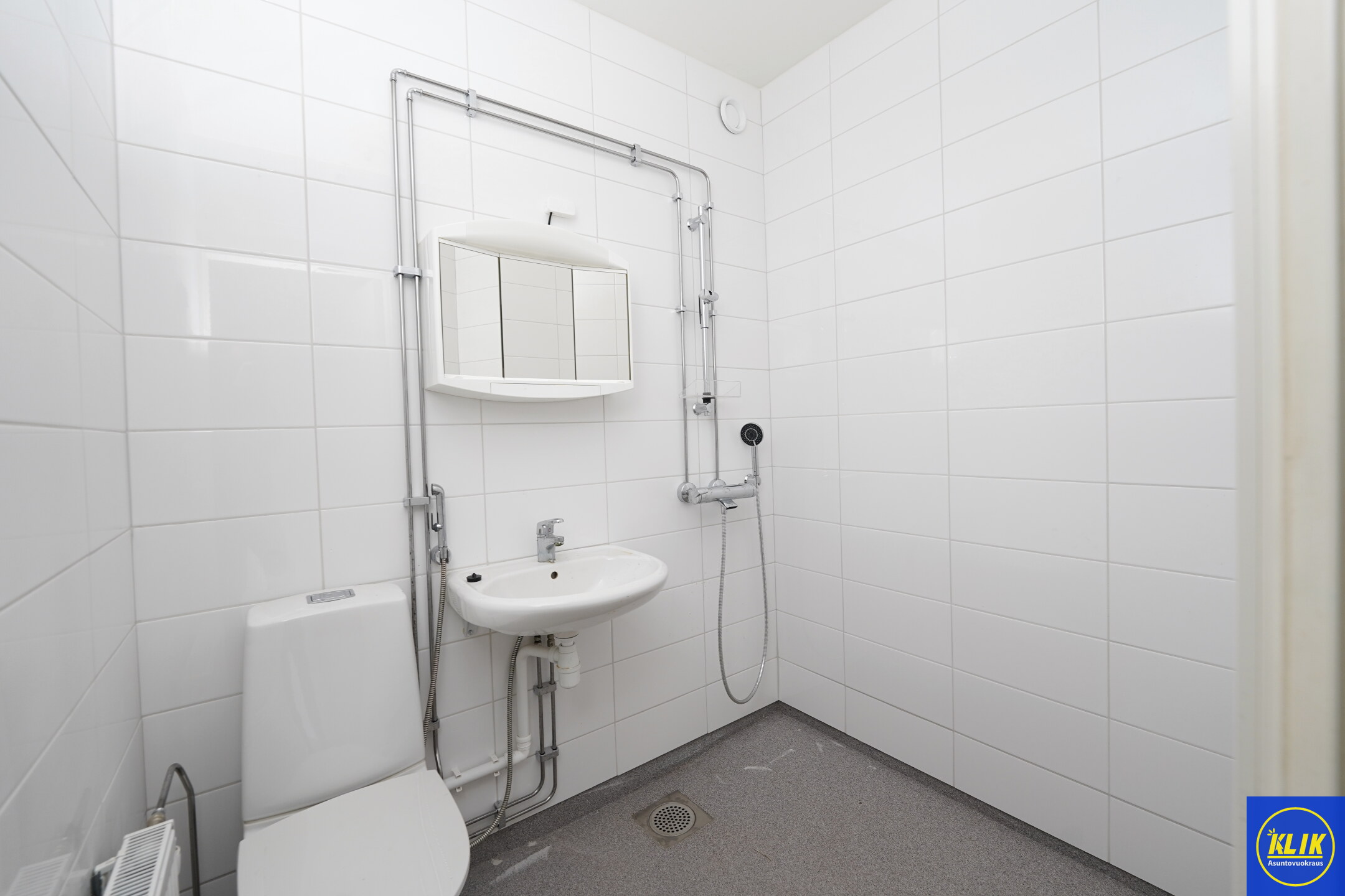 laattaseinä; epoksilattia, peilikaappi, suihku, pesukonevalmius