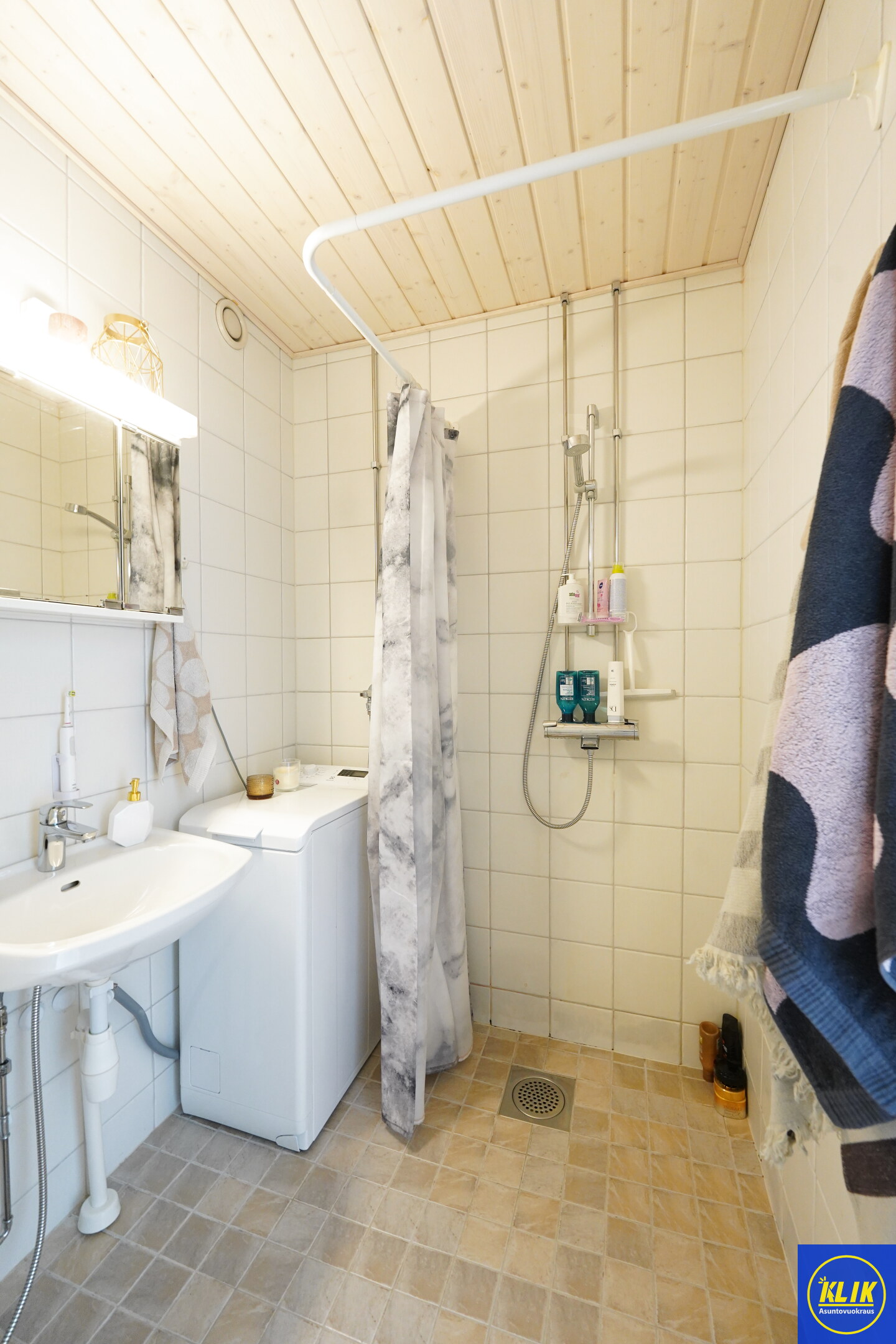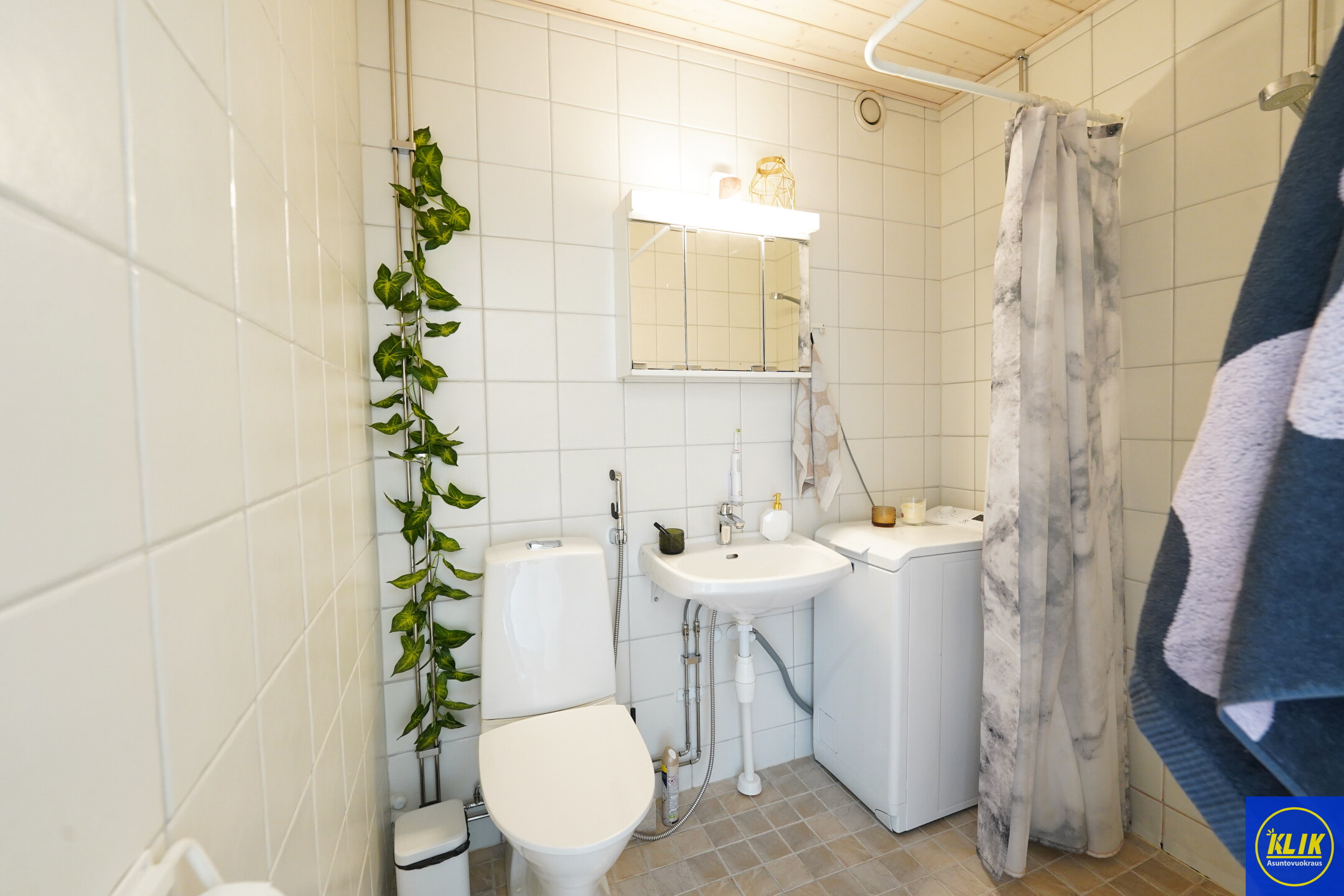 laattalattia; laattaseinä, , peilikaappi, suihku, , pesukonevalmius; taloyhtiössä pesutupa, taloyhtiössä sauna