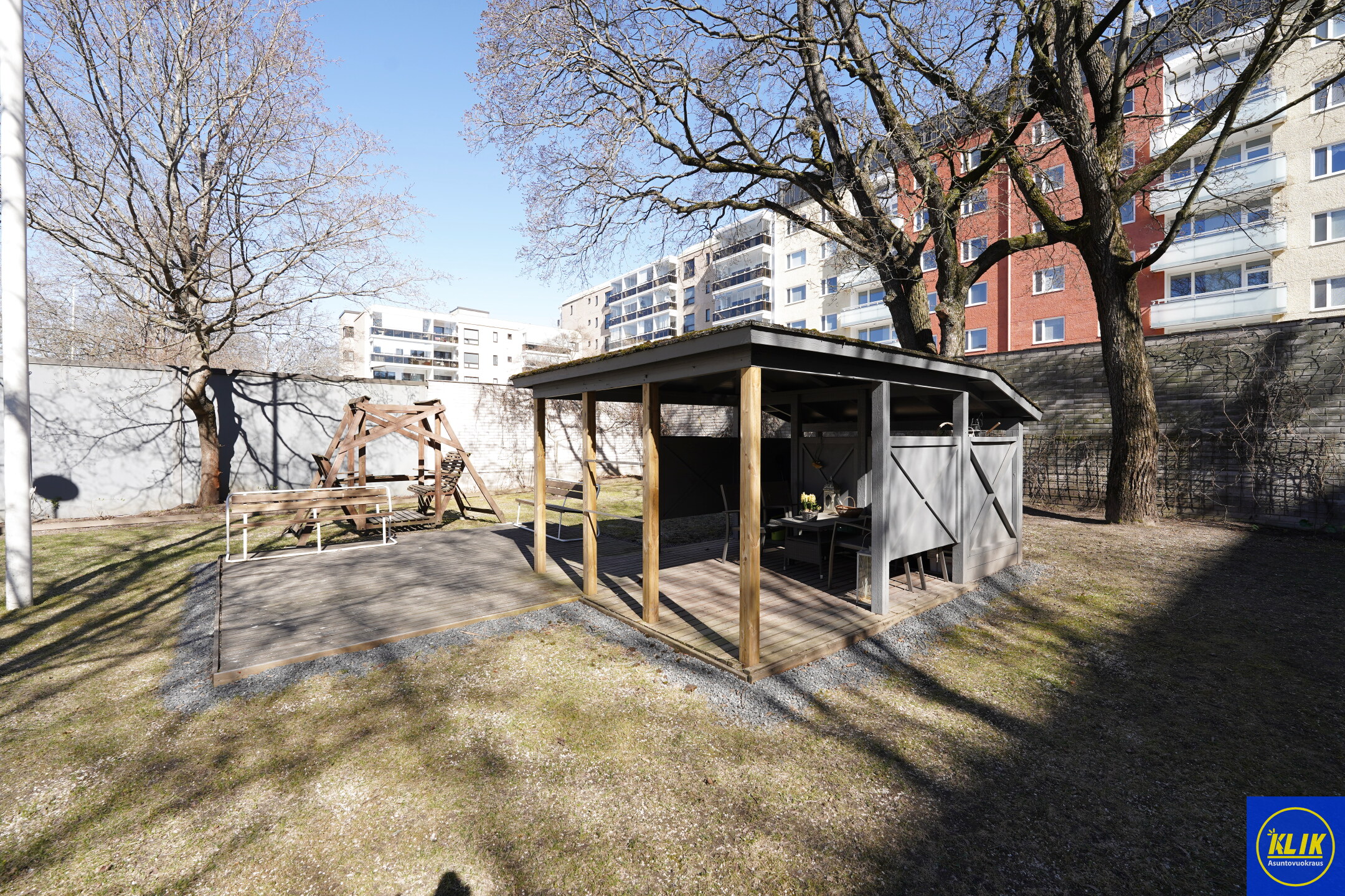 Sisäpiha on kauniiksi laitettu ja sieltä löytyy yhteinen oleskelualue pihakatoksineen!