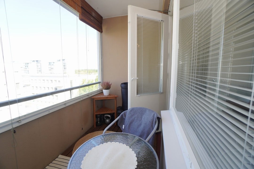 Olohuone on avara ja sieltä on käynti lasitetulla parvekkeelle. Parvekkeelta onkin hienot 5. kerroksen näkymät ja lasituksen ansiosta se on helppo sisustaa.