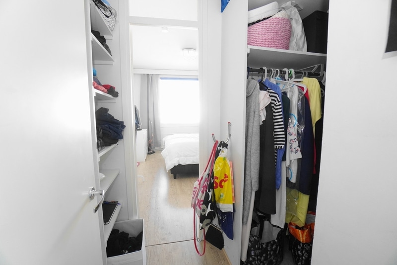 Makuuhuoneeseen mahtuu parisänky. Sen yhteydessä on iso vaatehuone, josta on läpikulku keittiöön.