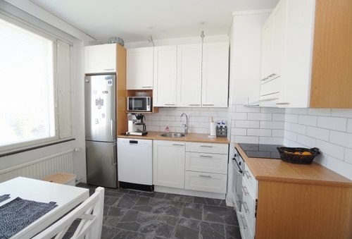 erillinen keittiö, laminaattitasot keittiössä, keraaminen- tai induktioliesi; liesi ja uuni erikseen; liesituuletin, astianpesukone (60cm), jääkaappipakastin
