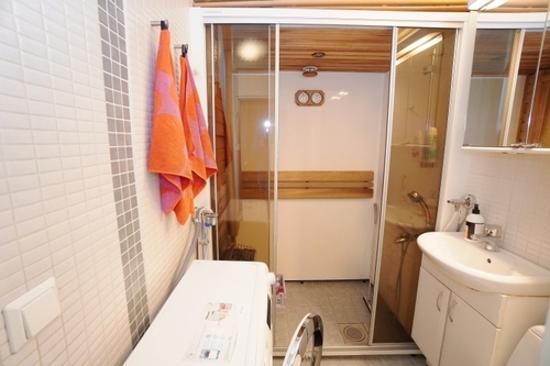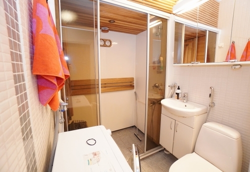 Kylpyhuone on sekin siistikuntoinen ja oma pieni sauna kruunaa kokonaisuuden.