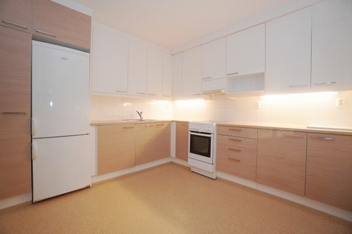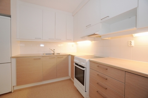 erillinen keittiö, laminaattitasot keittiössä, keraaminen- tai induktioliesi; liesituuletin, pesukoneliitos, jääkaappipakastin, tilaa isolle ruokapöydälle; paljon kaappitilaa; paljon työskentelytilaa