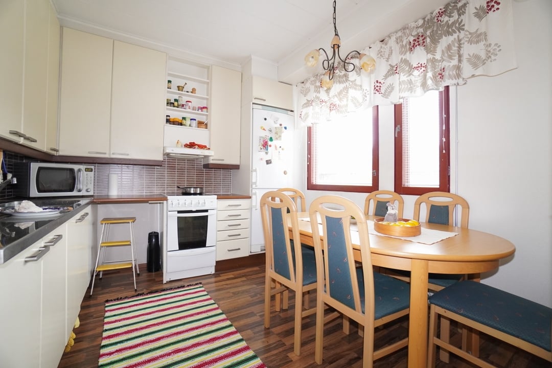 erillinen keittiö, laminaattitasot keittiössä, keraaminen- tai induktioliesi; liesituuletin, jääkaappipakastin, tilaa isolle ruokapöydälle; paljon kaappitilaa; paljon työskentelytilaa
