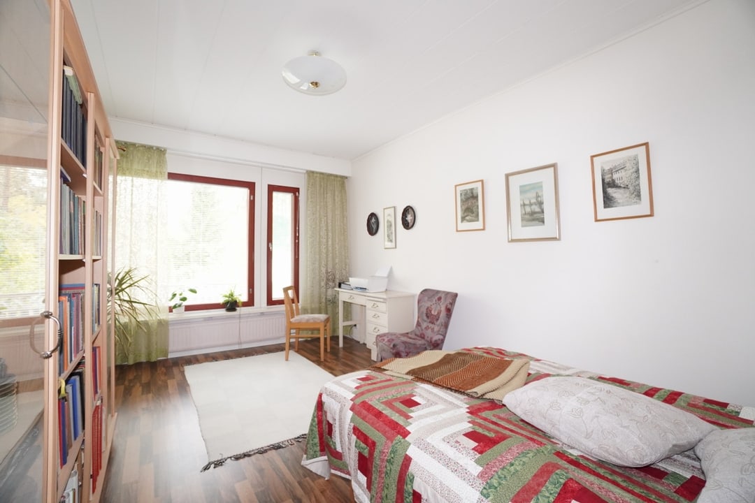 Kylpyhuone on kauttaaltaan kaakeloitu ja pesukoneelle on liitännät. Makuuhuone on tarpeeksi tilava sängylle ja muille huonekaluille.