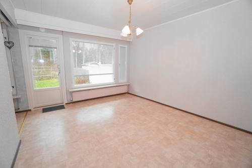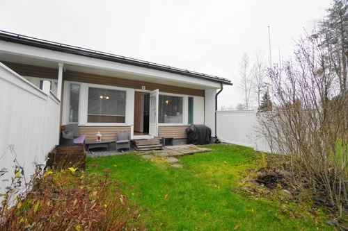 Olohuone on reilun kokoinen ja sieltä on käynti takapihan terassille. Terassille saa tarvittavat kalusteet mahtumaan. Suojaisa piha takaa oman rauhan ja sieltä aukeaa kaunis metsämaisema.