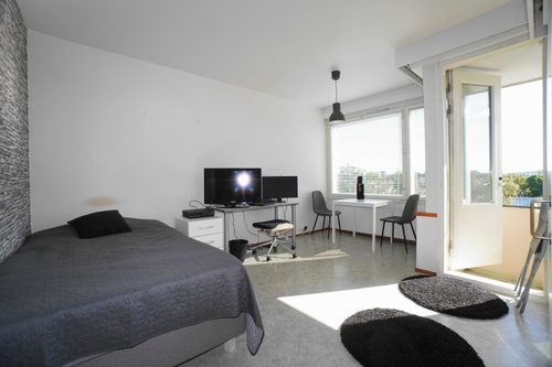 Ylimmän kerroksen yksiö, jossa hissi maan tasalta (esteetön). Iso eteinen, jossa kaappitilaa ja vaatehuone, huonetila avokeittiöllä ja parveke, josta avoimet maisemat.