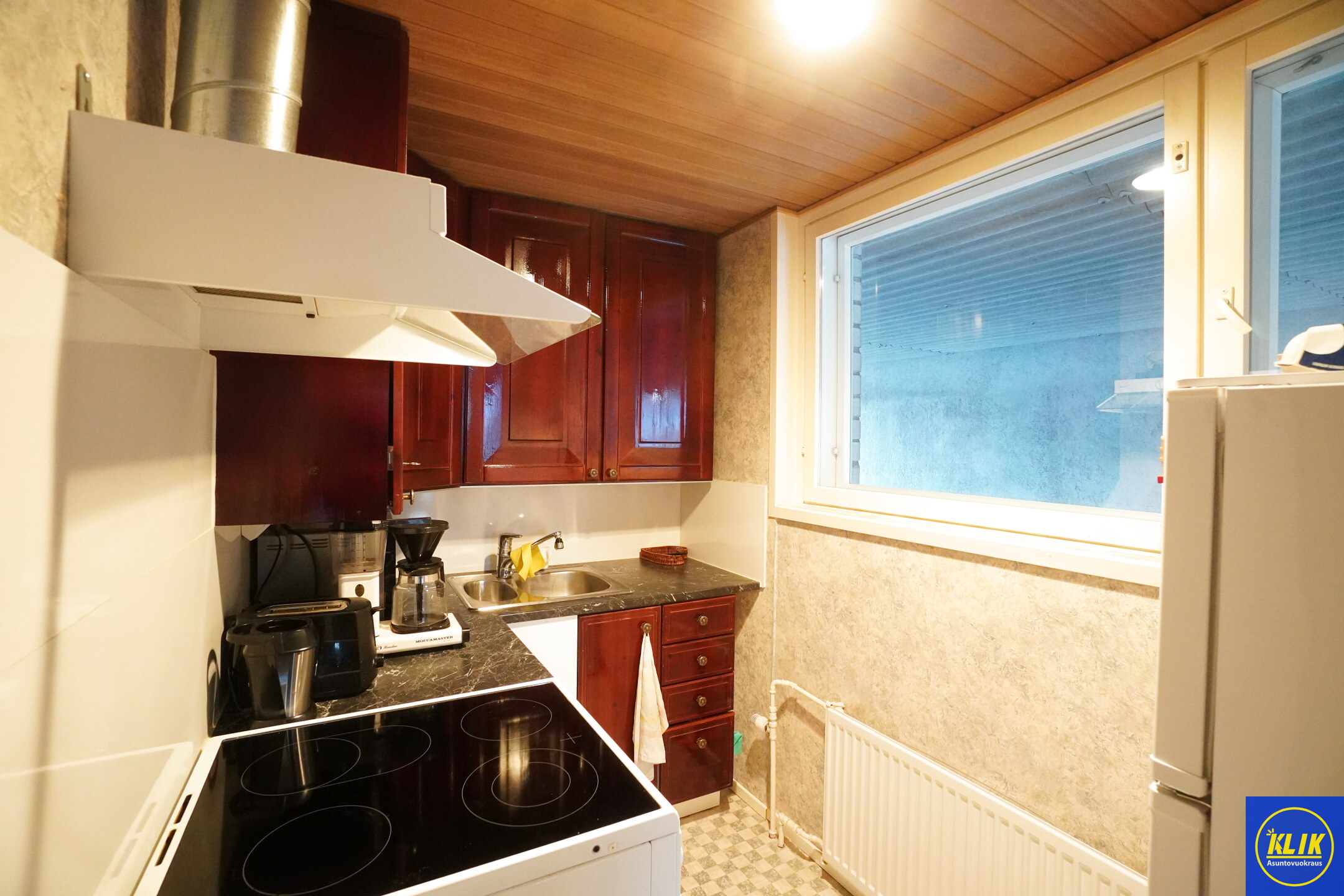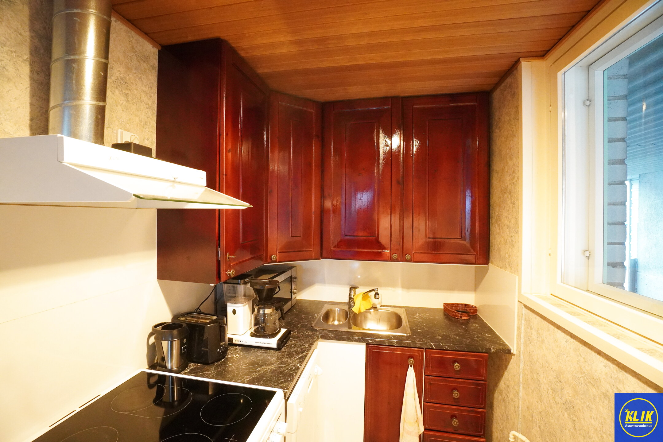 erillinen keittiölaminaattitasot keittiössä, keraaminen- tai induktioliesi; liesituuletin, astianpesukone (45cm), jääkaappipakastin,